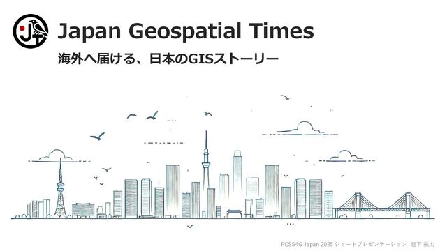 日本のGISストーリーを英語で海外向けに紹介するブログプラットフォーム • FOSS4Gの精神を尊重、オープンソースのプロジェクトとして構築(※) • 記事はマークダウン形式で執筆するとHTMLに自動反映される仕組みなので、他の方も気軽に参加可能 • リンク集(Resources)や記事執筆者の略歴紹介ページ(Profile)、専門用語の日英対照表(Glossary)も用意 ▲ トップページ ▲ 日英対照表 ▲ 執筆者紹介 ▲ リソース集 ▲ サイトURL https://jgtimes.org/ ※ウェブサイト自体のソースコードはBSD 3-Clause License、 記事はCC BY 4.0のデュアルライセンス構造としています。