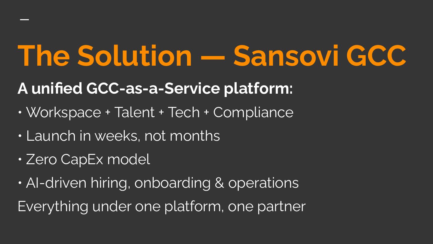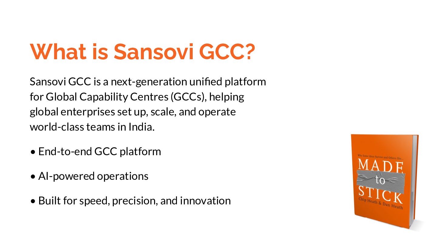 Sansovi GCC is a unified platform helping global enterprises set up and scale Global Capability Centres (GCCs) in India.