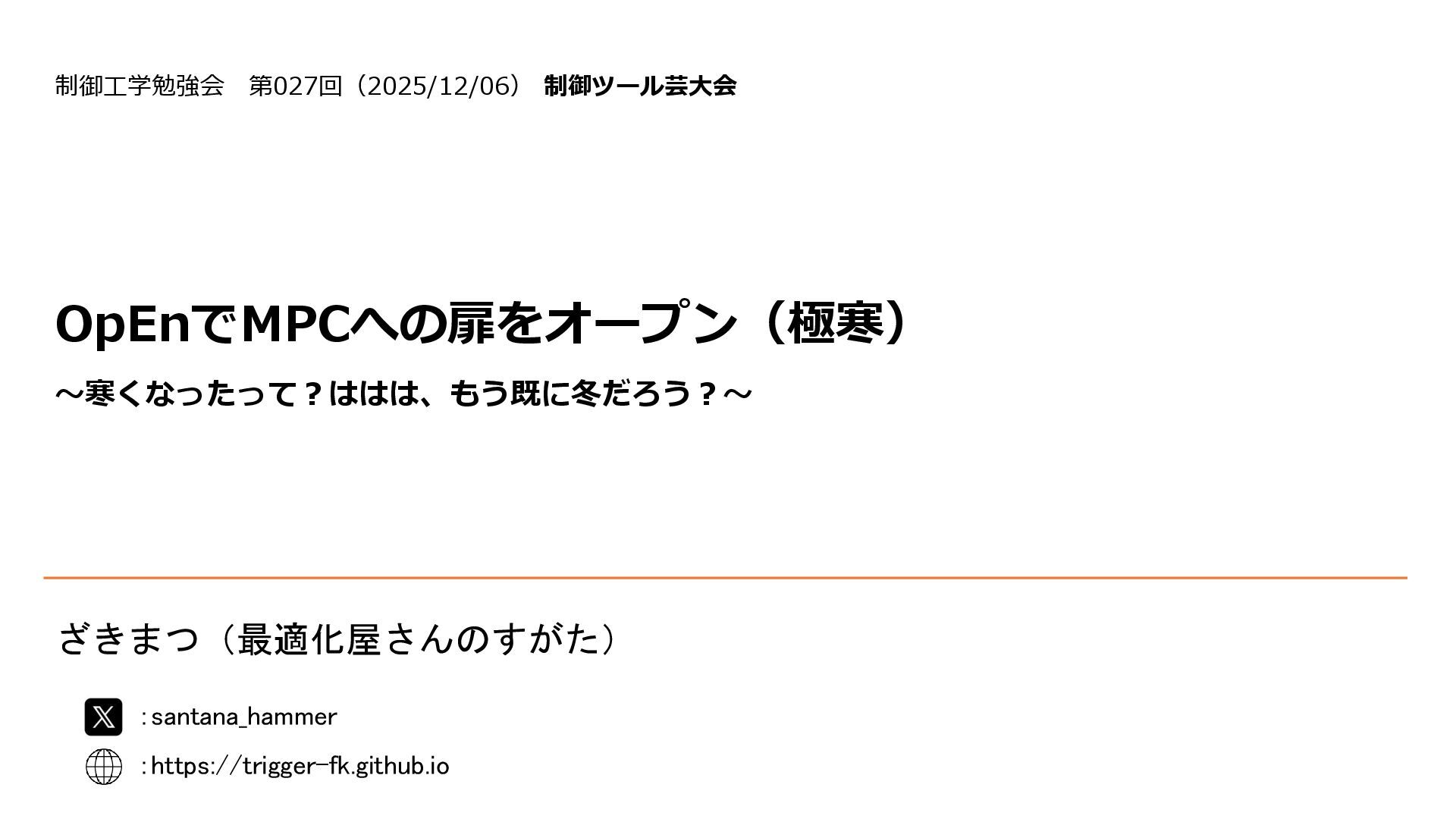 OpEnでMPCへの扉をオープン(極寒) ~寒くなったって?ははは、もう既に冬だろう?~ ざきまつ(最適化屋さんのすがた) 制御工学勉強会 第027回(2025/12/06) 制御ツール芸大会 :santana_hammer :https://trigger-fk.github.io