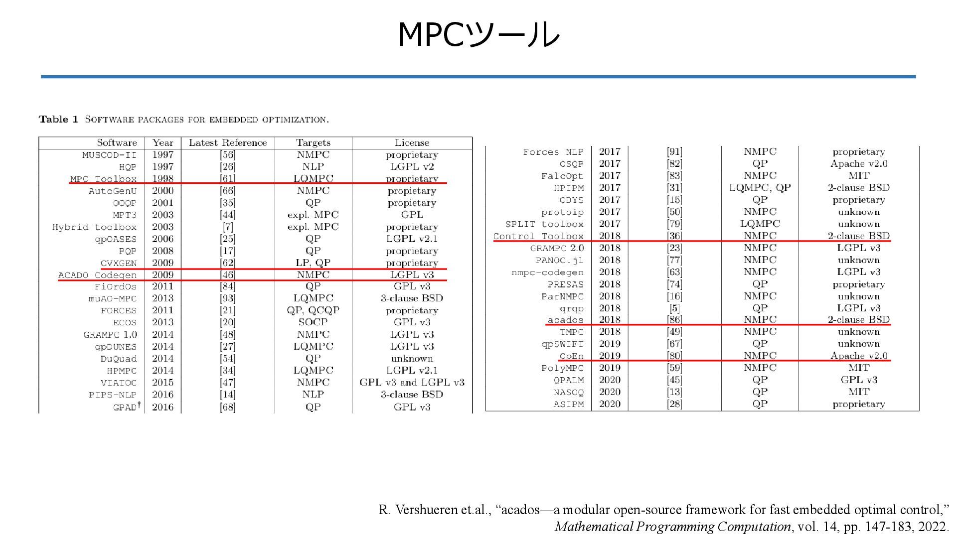 MPCツール R. Vershueren et.al., “acados—a modular open-source framework for fast