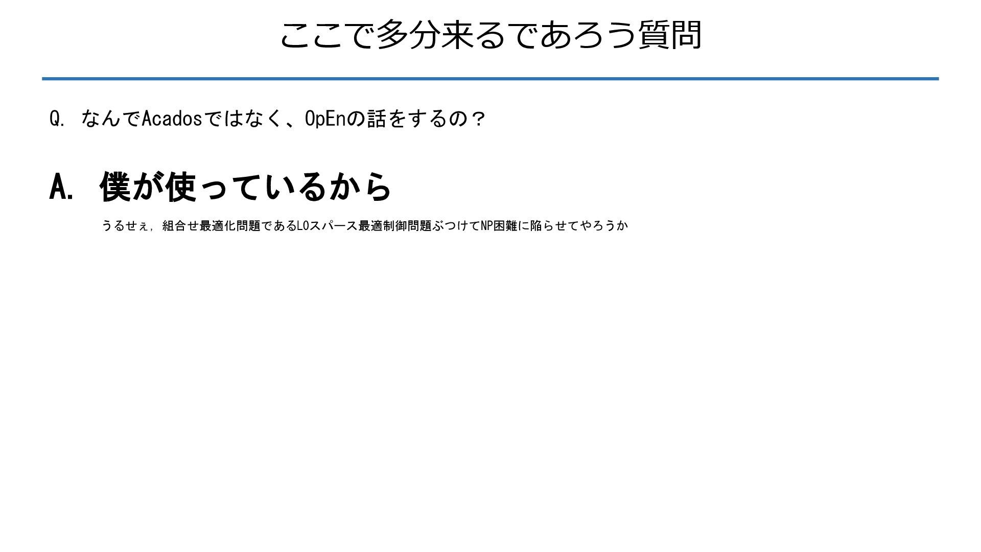 ここで多分来るであろう質問 Q. なんでAcadosではなく、OpEnの話をするの? A. 僕が使っているから うるせぇ,組合せ最適化問題であるL0スパース最適制御問題ぶつけてNP困難に陥らせてやろうか