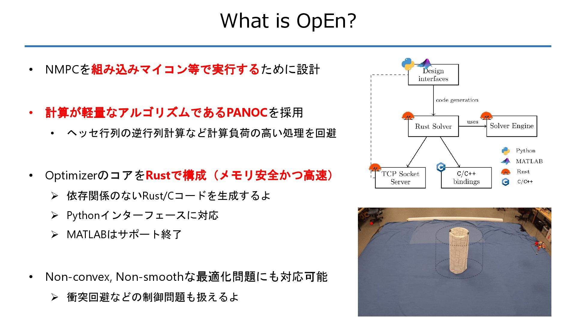 What is OpEn? • NMPCを組み込みマイコン等で実行するために設計 • 計算が軽量なアルゴリズムであるPANOCを採用 • ヘッセ行列の逆行列計算など計算負荷の高い処理を回避 •