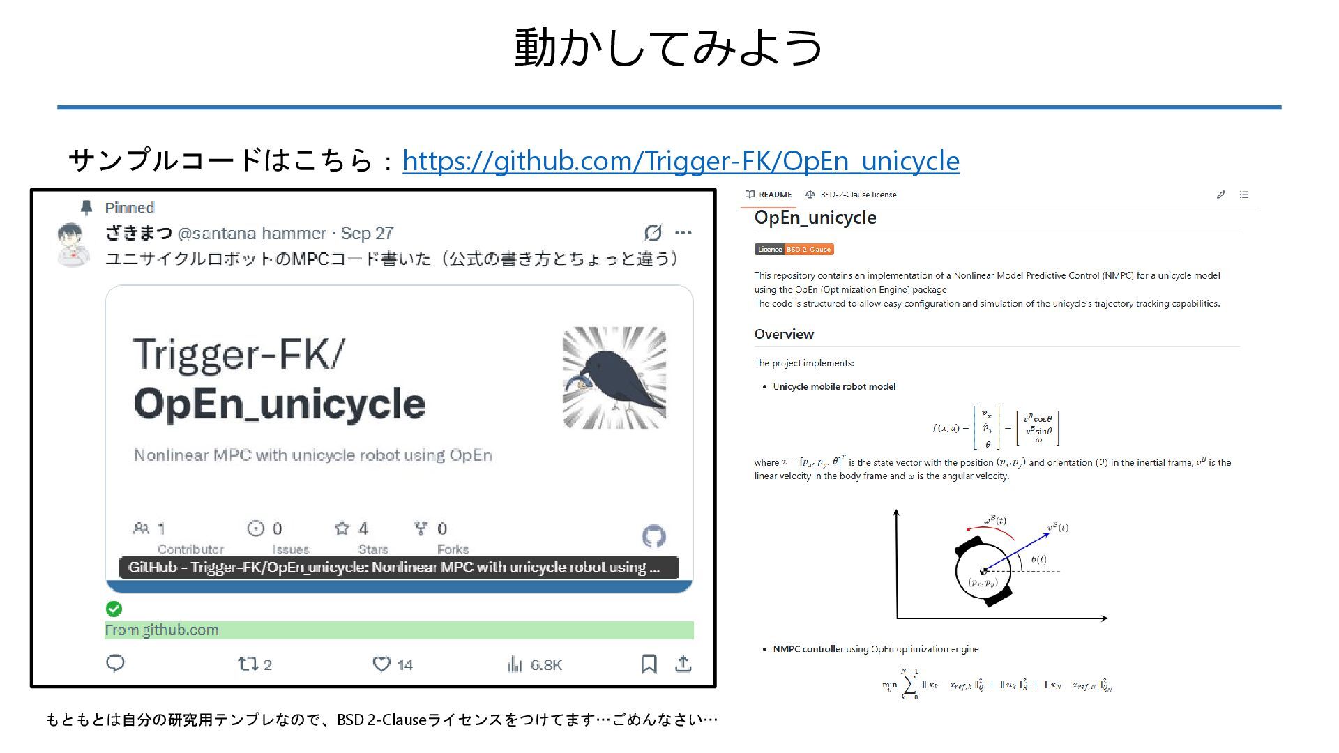 動かしてみよう サンプルコードはこちら:https://github.com/Trigger-FK/OpEn_unicycle もともとは自分の研究用テンプレなので、BSD 2-Clauseライセンスをつけてます…ごめんなさい…