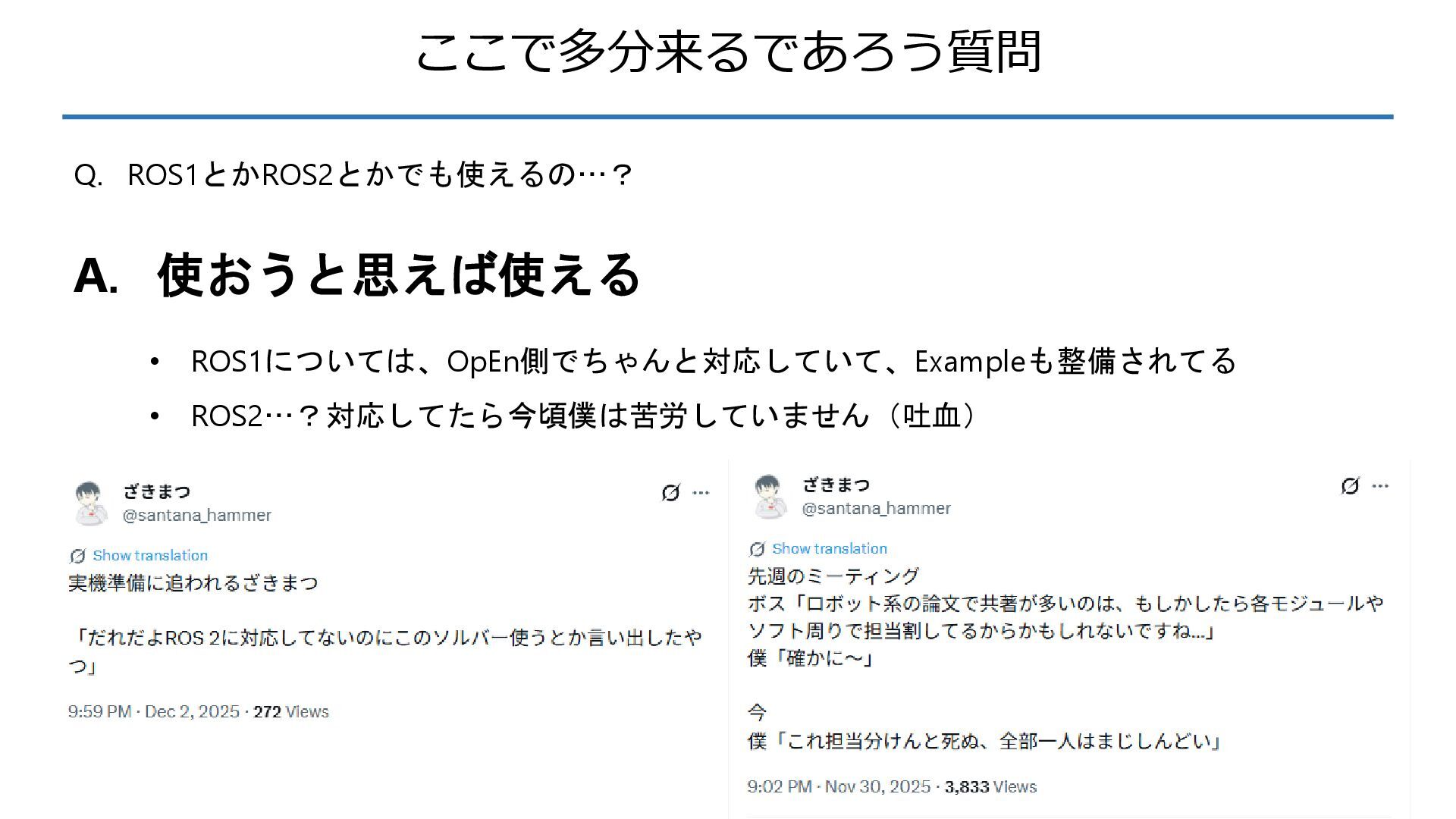 ここで多分来るであろう質問 Q. ROS1とかROS2とかでも使えるの…? A. 使おうと思えば使える • ROS1については、OpEn側でちゃんと対応していて、Exampleも整備されてる • ROS2…?対応してたら今頃僕は苦労していません(吐血)