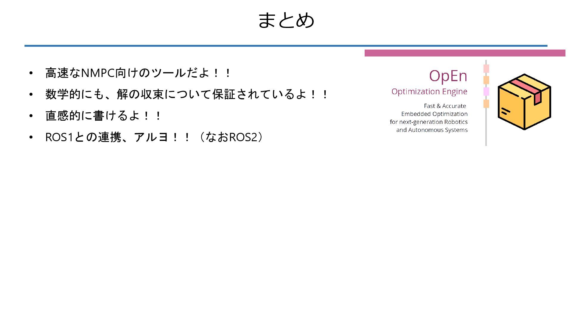 まとめ • 高速なNMPC向けのツールだよ!! • 数学的にも、解の収束について保証されているよ!! • 直感的に書けるよ!! • ROS1との連携、アルヨ!!(なおROS2)