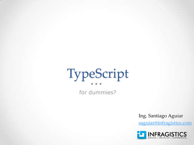 a constructor AnUglyGlobal.prototype.doIt = function(x) { return this.field + x; } // a method JS Libraries interface UglyGlobal { field: string; doIt(value: string); } declare var AnUglyGlobal : UglyGlobal; /// <reference path="external.d.ts"/> AnUglyGlobal.doIt("foo"); Una library en JS: external.js La declaración de la library para TS: external.d.ts El código TS que usa la library: uses_external.ts DefinitelyTyped define los tipos de más de 130 libraries Angular, underscore, Jquery, ember, Knockout, etc.. https://github.com/borisyank ov/DefinitelyTyped