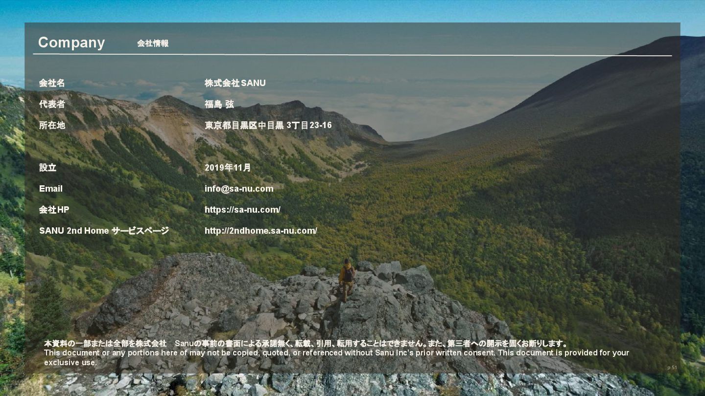 株式会社SANU 福島 弦 東京都目黒区中目黒 3丁目23-16 2019年11月 [email protected] https://sa-nu.com/ http://2ndhome.sa-nu.com/ Company 会社情報 p 51 本資料の一部または全部を株式会社 Sanuの事前の書面による承諾無く、転載、引用、転用することはできません。また、第三者への開示を固くお断りします。 This document or any portions here of may not be copied, quoted, or referenced without Sanu Inc’s prior written consent. This document is provided for your exclusive use.