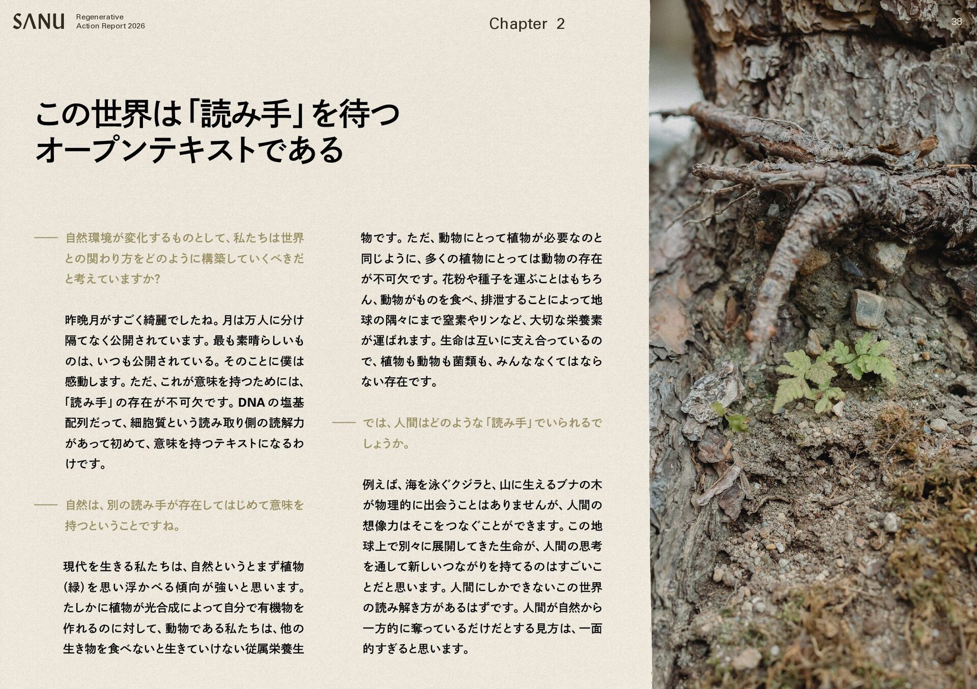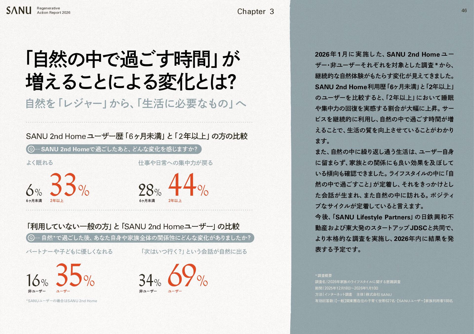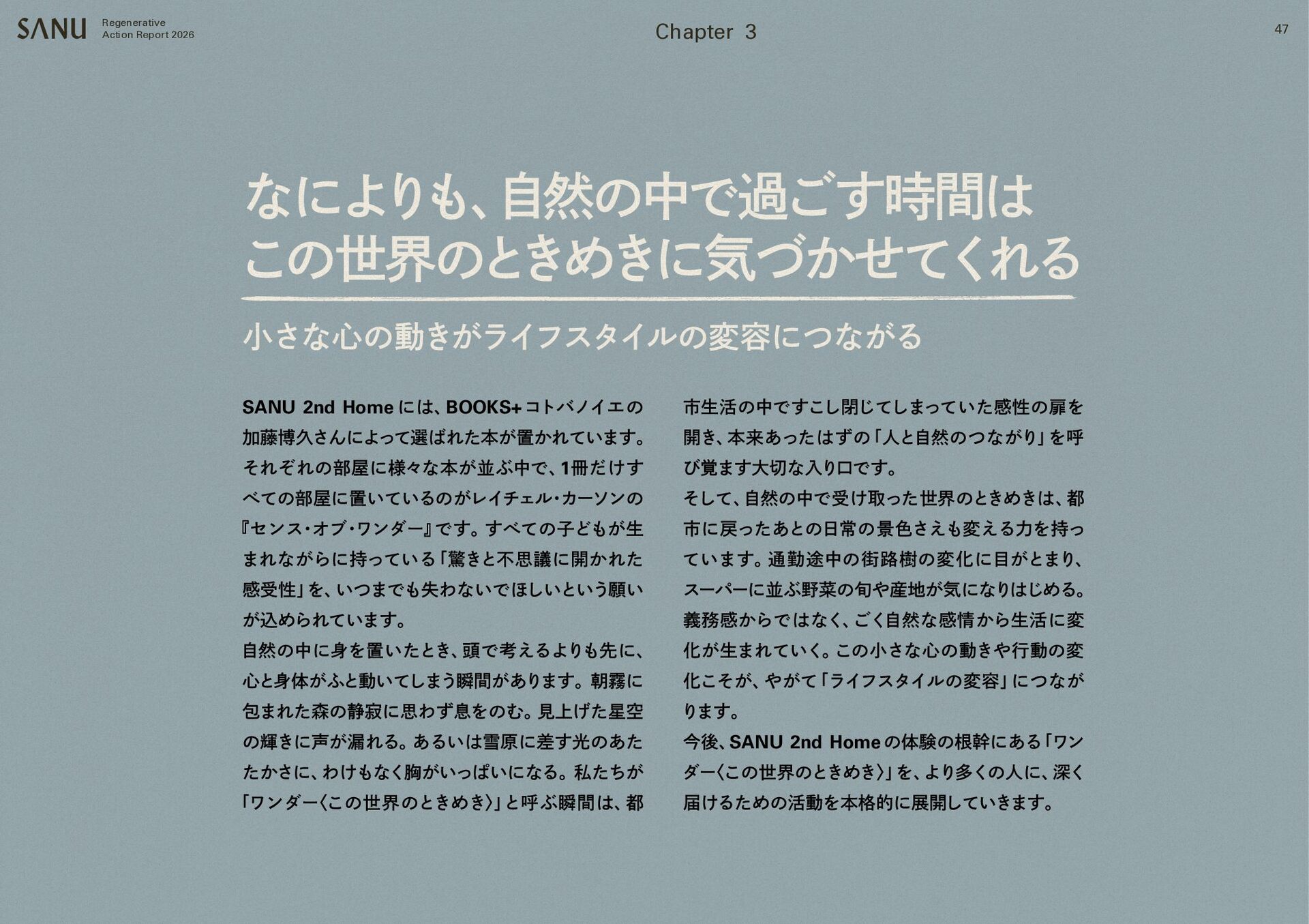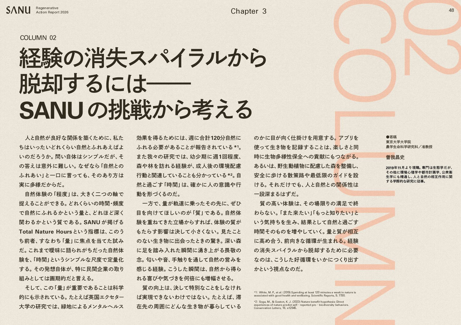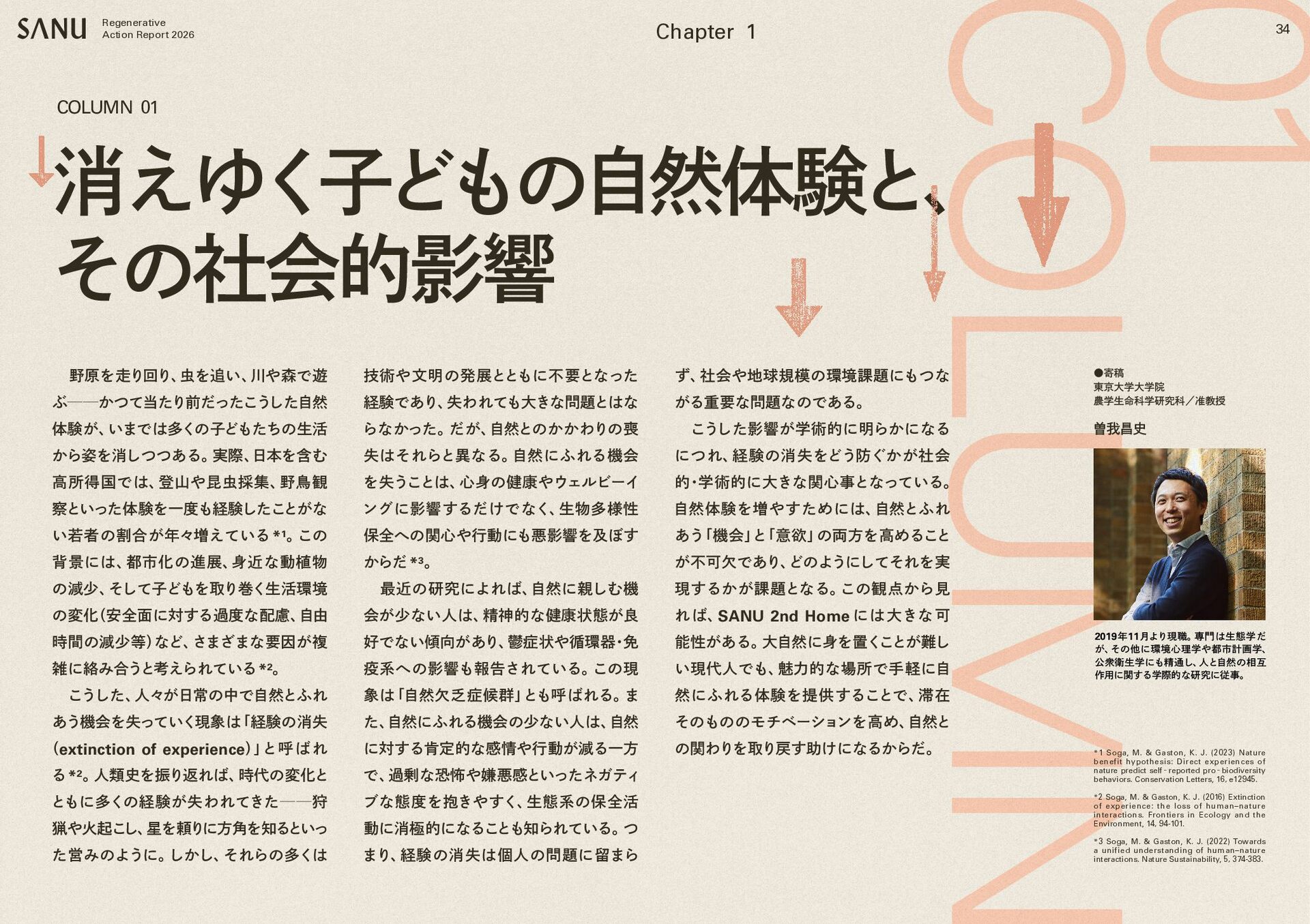 ぶ──かつて当たり前だったこうした自然 体験が、 いまでは多くの子どもたちの生活 から姿を消しつつある。 実際、 日本を含む 高所得国では、 登山や昆虫採集、 野鳥観 察といった体験を一度も経験したことがな い若者の割合が年々増えている*¹。 この 背景には、 都市化の進展、 身近な動植物 の減少、 そして子どもを取り巻く生活環境 の変化 (安全面に対する過度な配慮、 自由 時間の減少等) など、 さまざまな要因が複 雑に絡み合うと考えられている*²。 こうした、 人々が日常の中で自然とふれ あう機会を失っていく現象は 「経験の消失 (extinction of experience) 」 と呼ばれ る*²。 人類史を振り返れば、 時代の変化と ともに多くの経験が失われてきた──狩 猟や火起こ し、 星を頼りに方角を知る といっ た営みのように。 しかし、 それらの多くは 技術や文明の発展とともに不要となった 経験であり、 失われても大きな問題とはな らなかった。 だが、 自然とのかかわりの喪 失はそれらと異なる。 自然にふれる機会 を失うことは、 心身の健康やウェルビーイ ングに影響するだけでなく、 生物多様性 保全への関心や行動にも悪影響を及ぼす からだ*³。 最近の研究によれば、 自然に親しむ機 会が少ない人は、 精神的な健康状態が良 好でない傾向があり、 鬱症状や循環器 ・ 免 疫系への影響も報告されている。 この現 象は 「自然欠乏症候群」 とも呼ばれる。 ま た、 自然にふれる機会の少ない人は、 自然 に対する肯定的な感情や行動が減る一方 で、 過剰な恐怖や嫌悪感といったネガティ ブな態度を抱きやすく、 生態系の保全活 動に消極的になることも知られている。 つ まり、 経験の消失は個人の問題に留まら ず、 社会や地球規模の環境課題にもつな がる重要な問題なのである。 こうした影響が学術的に明らかになる につれ、 経験の消失をどう防ぐかが社会 的 ・ 学術的に大きな関心事となっている。 自然体験を増やすためには、 自然とふれ あう 「機会」 と 「意欲」 の両方を高めること が不可欠であり、 どのようにしてそれを実 現するかが課題となる。 この観点から見 れば、 SANU 2nd Home には大きな可 能性がある。 大自然に身を置くことが難し い現代人でも、 魅力的な場所で手軽に自 然にふれる体験を提供することで、 滞在 そのもののモチベーションを高め、 自然と の関わりを取り戻す助けになるからだ。 *1 Soga, M. & Gaston, K. J. (2023) Nature benefit hypothesis: Direct experiences of nature predict selfʖreported proʖbiodiversity behaviors. Conservation Letters, 16, e12945. *2 Soga, M. & Gaston, K. J. (2016) Extinction of experience: the loss of human–nature interactions. Frontiers in Ecology and the Environment, 14, 94-101. *3 Soga, M. & Gaston, K. J. (2022) Towards a unified understanding of human–nature interactions. Nature Sustainability, 5, 374-383. •寄稿 東京大学大学院 農学生命科学研究科/准教授 曽我昌史 2019年11月より現職。 専門は生態学だ が、 その他に環境心理学や都市計画学、 公衆衛生学にも精通し、 人と自然の相互 作用に関する学際的な研究に従事。 Regenerative Action Report 2026 34 Chapter 1