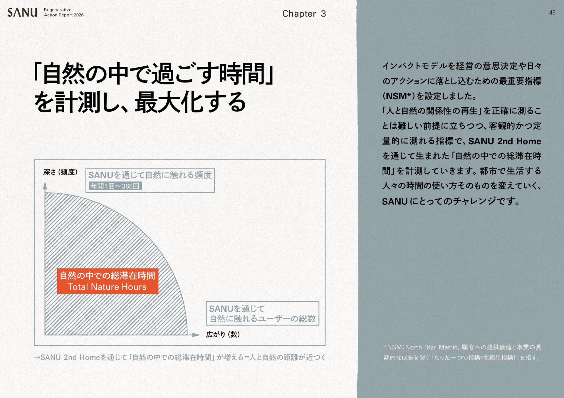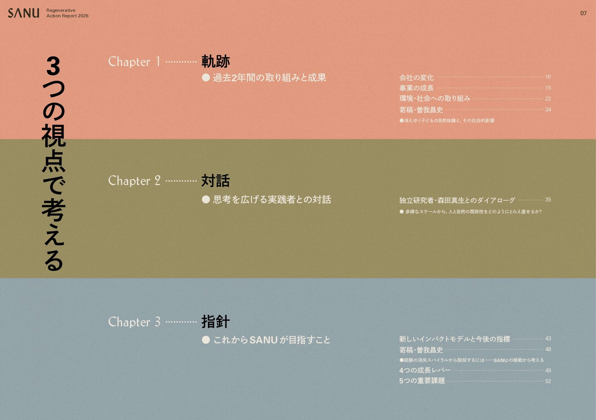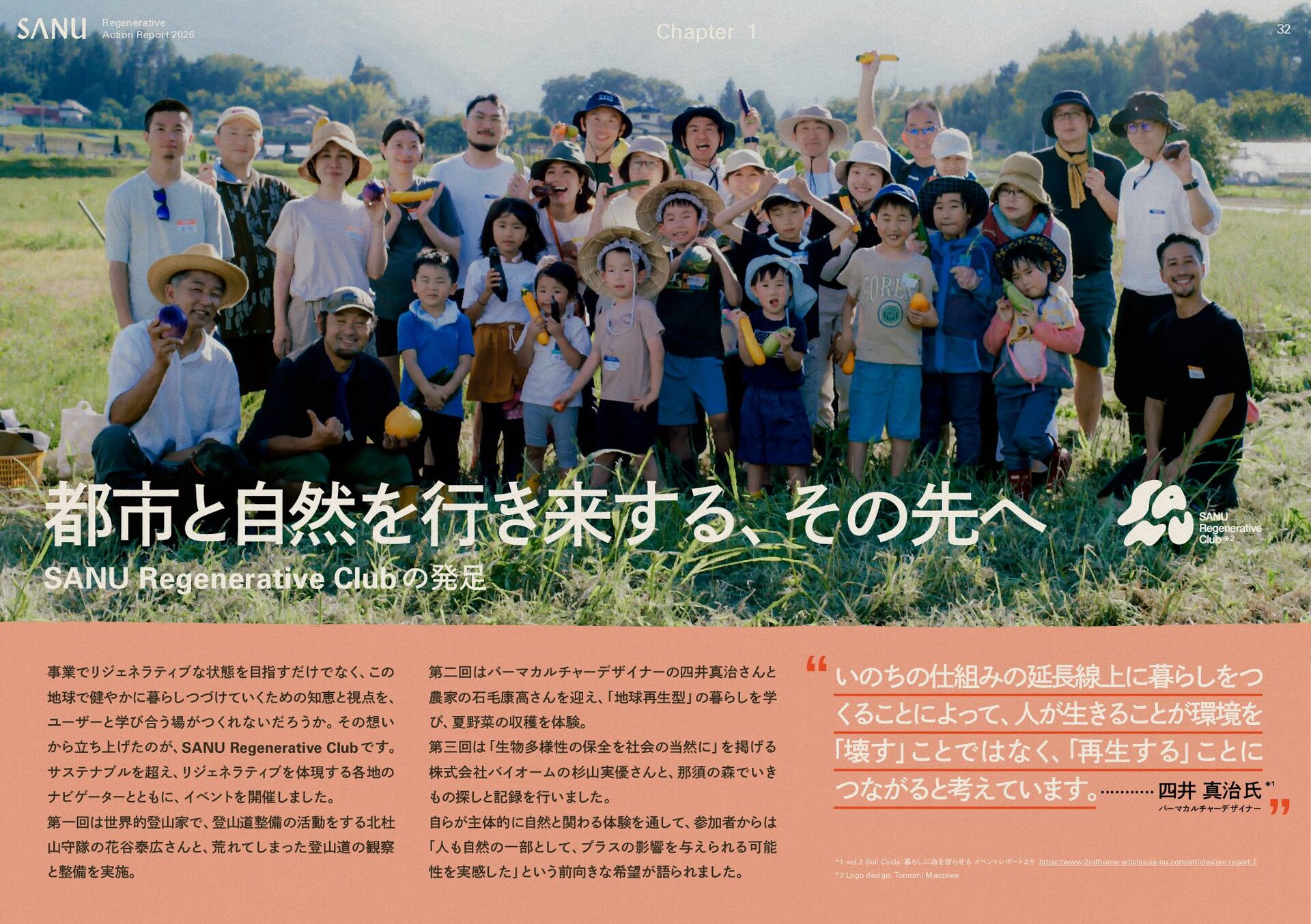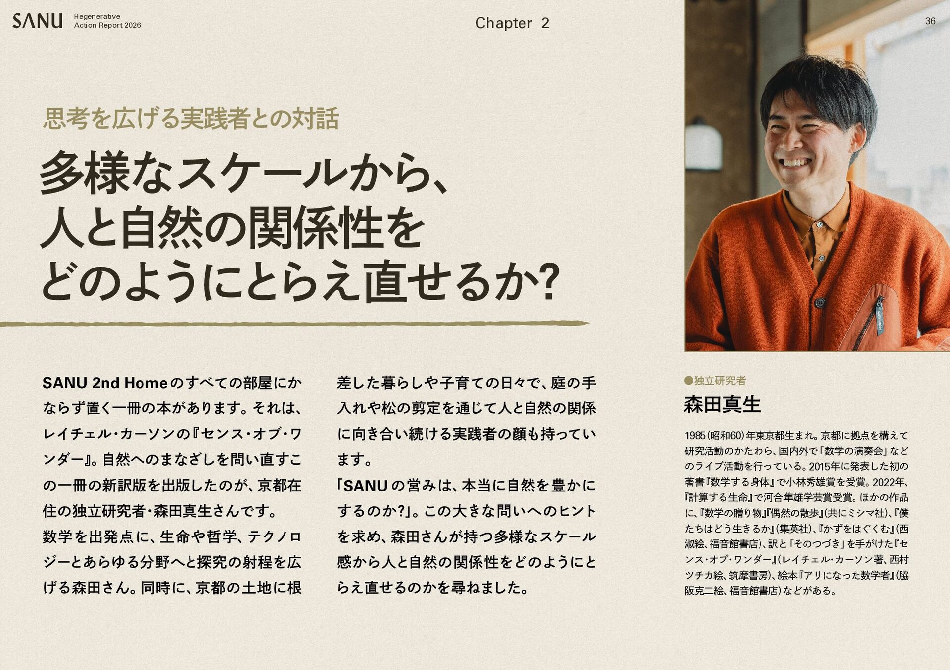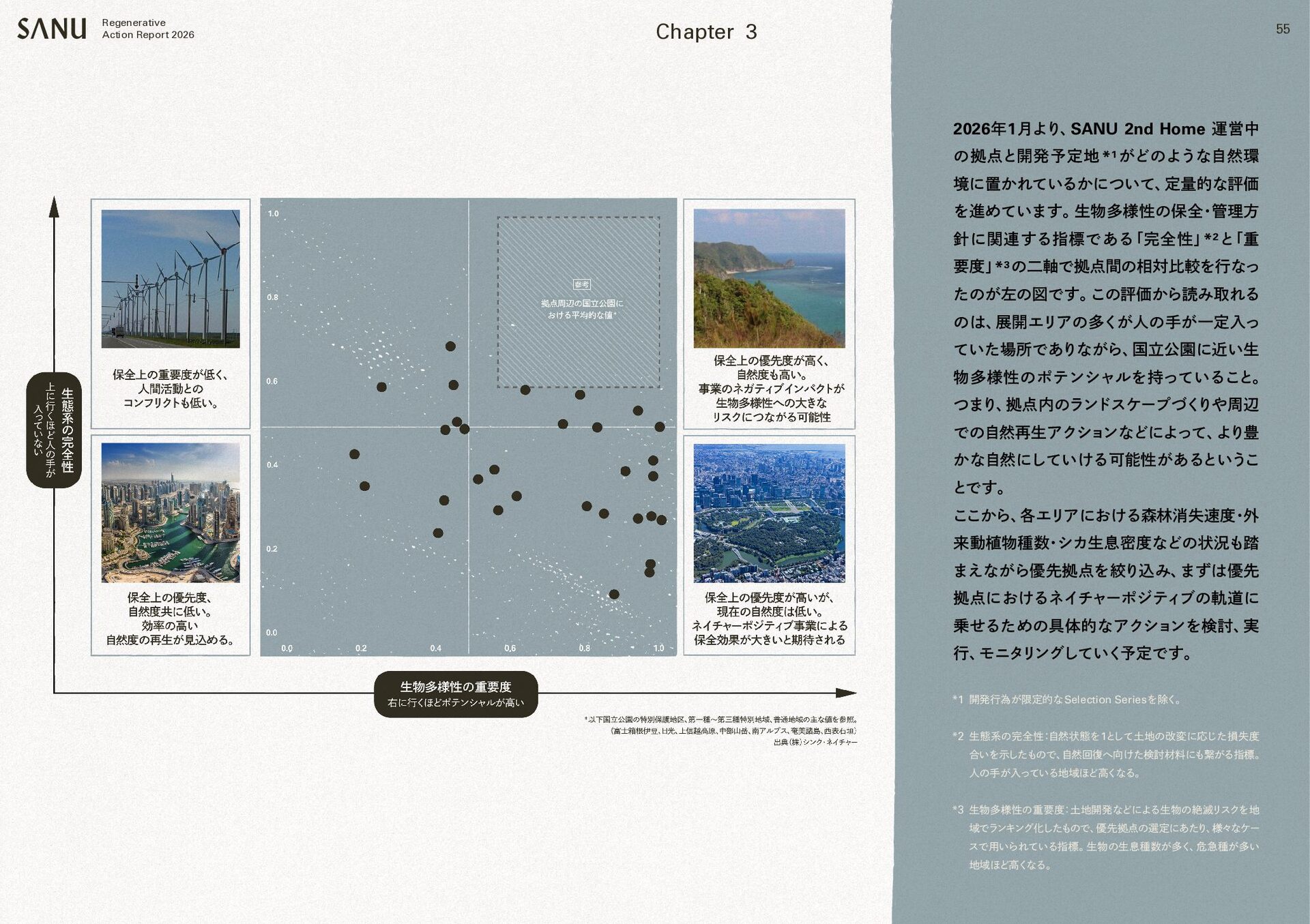 ぶ──かつて当たり前だったこうした自然 体験が、 いまでは多くの子どもたちの生活 から姿を消しつつある。 実際、 日本を含む 高所得国では、 登山や昆虫採集、 野鳥観 察といった体験を一度も経験したことがな い若者の割合が年々増えている*¹。 この 背景には、 都市化の進展、 身近な動植物 の減少、 そして子どもを取り巻く生活環境 の変化 (安全面に対する過度な配慮、 自由 時間の減少等) など、 さまざまな要因が複 雑に絡み合うと考えられている*²。 こうした、 人々が日常の中で自然とふれ あう機会を失っていく現象は 「経験の消失 (extinction of experience) 」 と呼ばれ る*²。 人類史を振り返れば、 時代の変化と ともに多くの経験が失われてきた──狩 猟や火起こ し、 星を頼りに方角を知る といっ た営みのように。 しかし、 それらの多くは 技術や文明の発展とともに不要となった 経験であり、 失われても大きな問題とはな らなかった。 だが、 自然とのかかわりの喪 失はそれらと異なる。 自然にふれる機会 を失うことは、 心身の健康やウェルビーイ ングに影響するだけでなく、 生物多様性 保全への関心や行動にも悪影響を及ぼす からだ*³。 最近の研究によれば、 自然に親しむ機 会が少ない人は、 精神的な健康状態が良 好でない傾向があり、 鬱症状や循環器 ・ 免 疫系への影響も報告されている。 この現 象は 「自然欠乏症候群」 とも呼ばれる。 ま た、 自然にふれる機会の少ない人は、 自然 に対する肯定的な感情や行動が減る一方 で、 過剰な恐怖や嫌悪感といったネガティ ブな態度を抱きやすく、 生態系の保全活 動に消極的になることも知られている。 つ まり、 経験の消失は個人の問題に留まら ず、 社会や地球規模の環境課題にもつな がる重要な問題なのである。 こうした影響が学術的に明らかになる につれ、 経験の消失をどう防ぐかが社会 的 ・ 学術的に大きな関心事となっている。 自然体験を増やすためには、 自然とふれ あう 「機会」 と 「意欲」 の両方を高めること が不可欠であり、 どのようにしてそれを実 現するかが課題となる。 この観点から見 れば、 SANU 2nd Home には大きな可 能性がある。 大自然に身を置くことが難し い現代人でも、 魅力的な場所で手軽に自 然にふれる体験を提供することで、 滞在 そのもののモチベーションを高め、 自然と の関わりを取り戻す助けになるからだ。 *1 Soga, M. & Gaston, K. J. (2023) Nature benefit hypothesis: Direct experiences of nature predict selfʖreported proʖbiodiversity behaviors. Conservation Letters, 16, e12945. *2 Soga, M. & Gaston, K. J. (2016) Extinction of experience: the loss of human–nature interactions. Frontiers in Ecology and the Environment, 14, 94-101. *3 Soga, M. & Gaston, K. J. (2022) Towards a unified understanding of human–nature interactions. Nature Sustainability, 5, 374-383. •寄稿 東京大学大学院 農学生命科学研究科/准教授 曽我昌史 2019年11月より現職。 専門は生態学だ が、 その他に環境心理学や都市計画学、 公衆衛生学にも精通し、 人と自然の相互 作用に関する学際的な研究に従事。 Regenerative Action Report 2026 34 Chapter 1