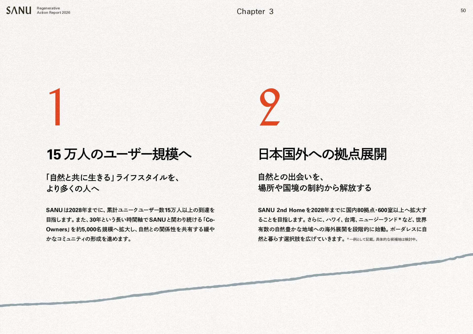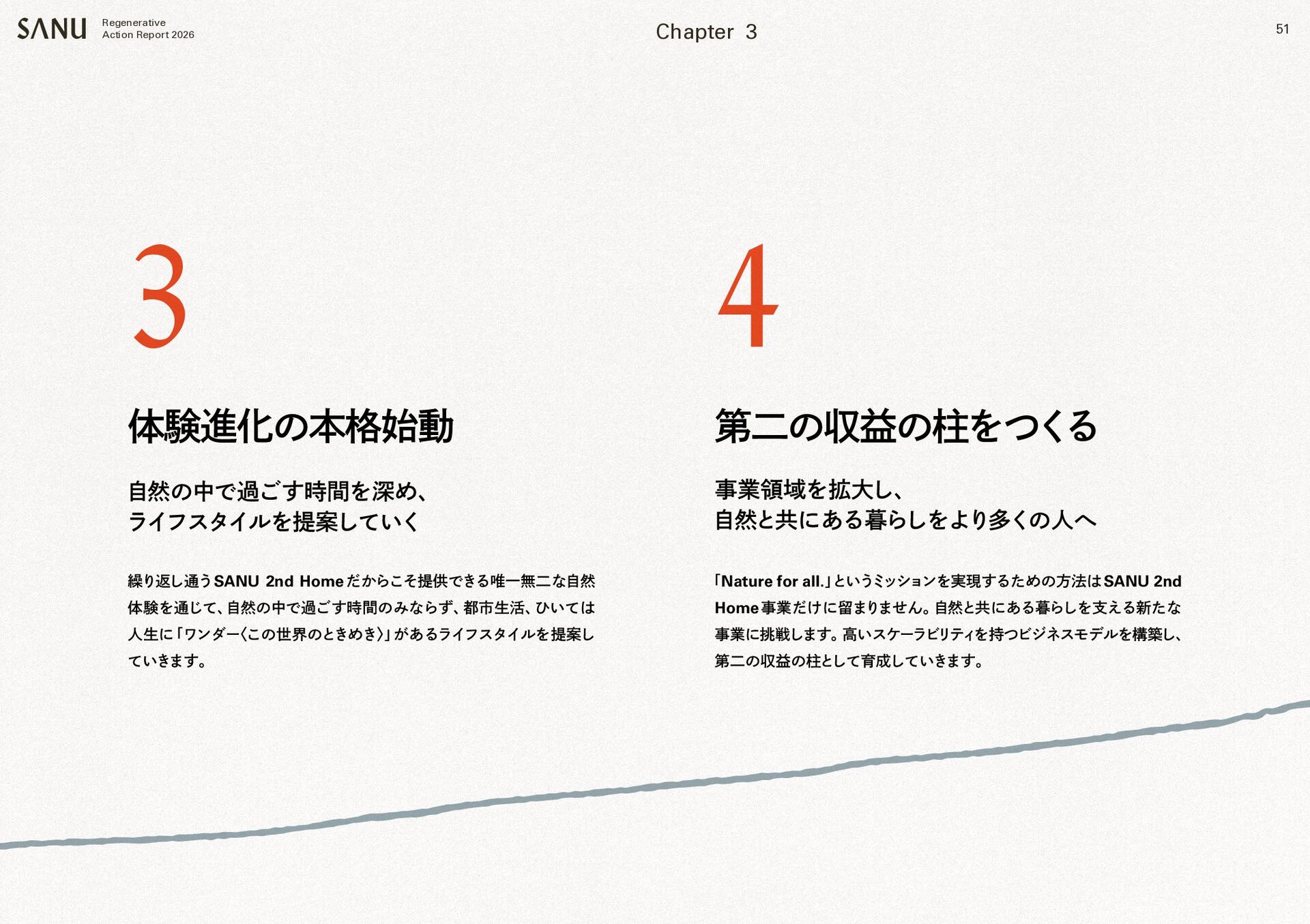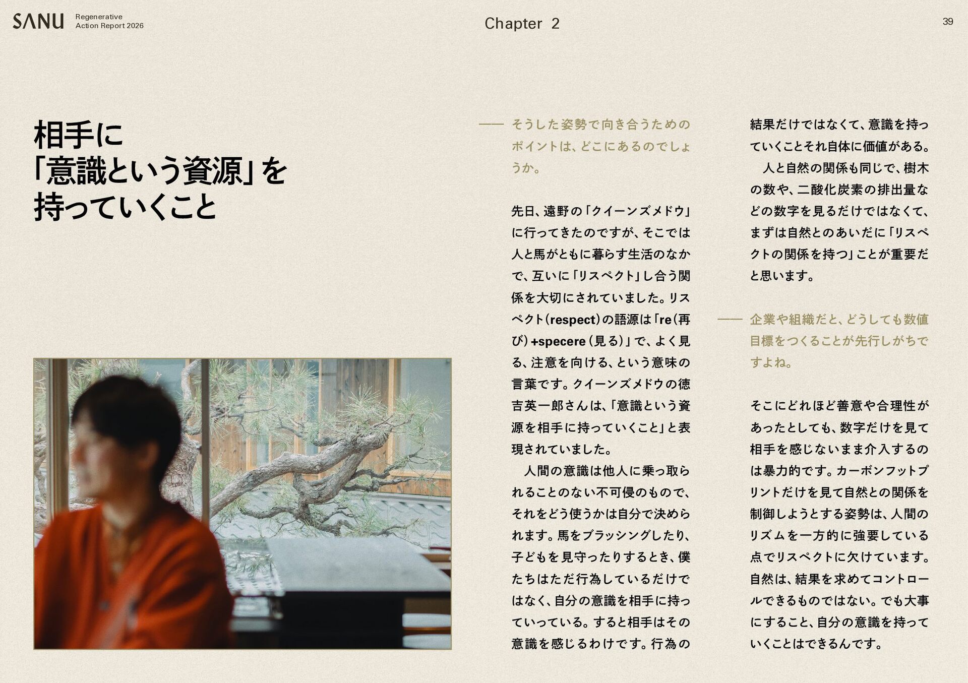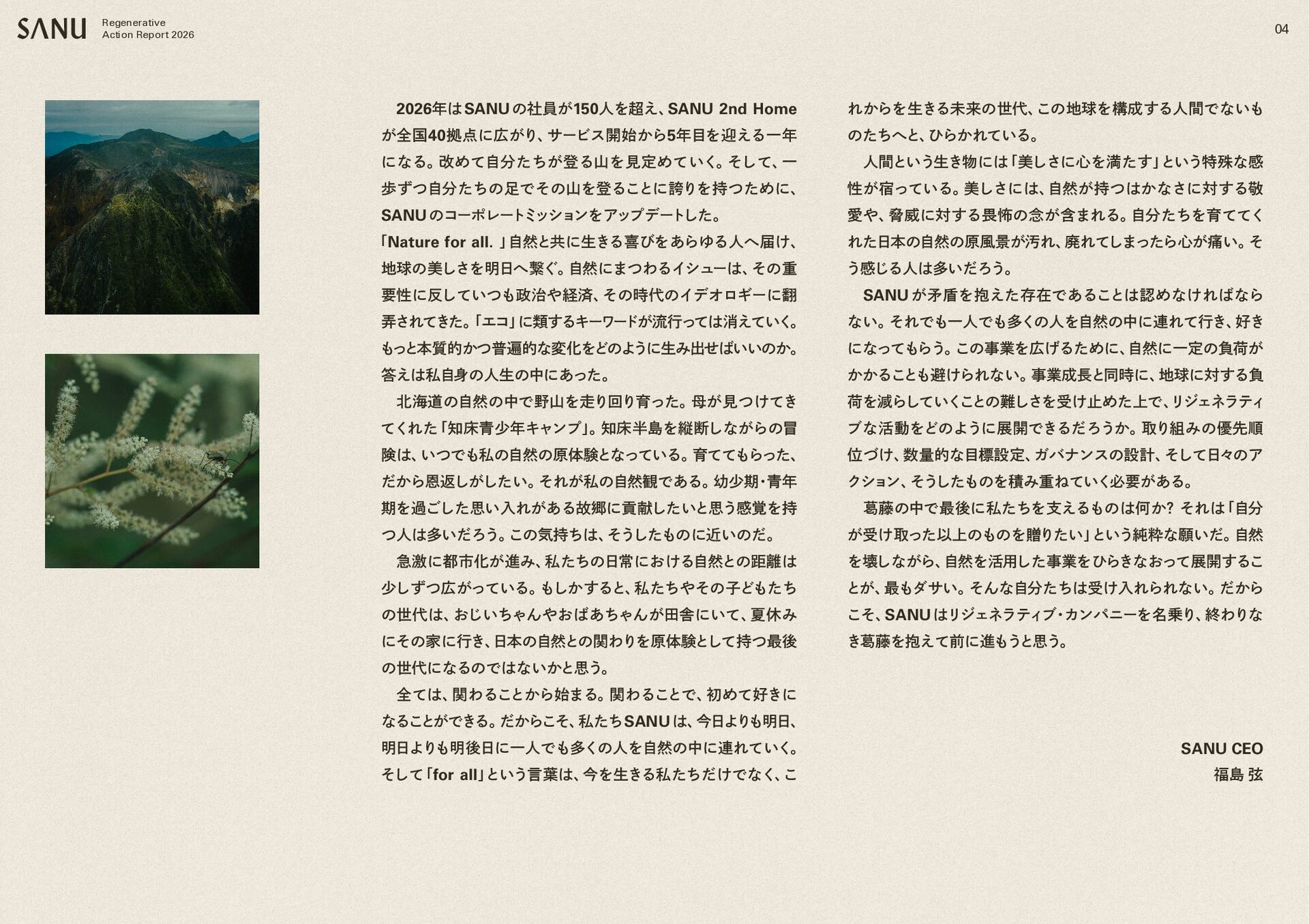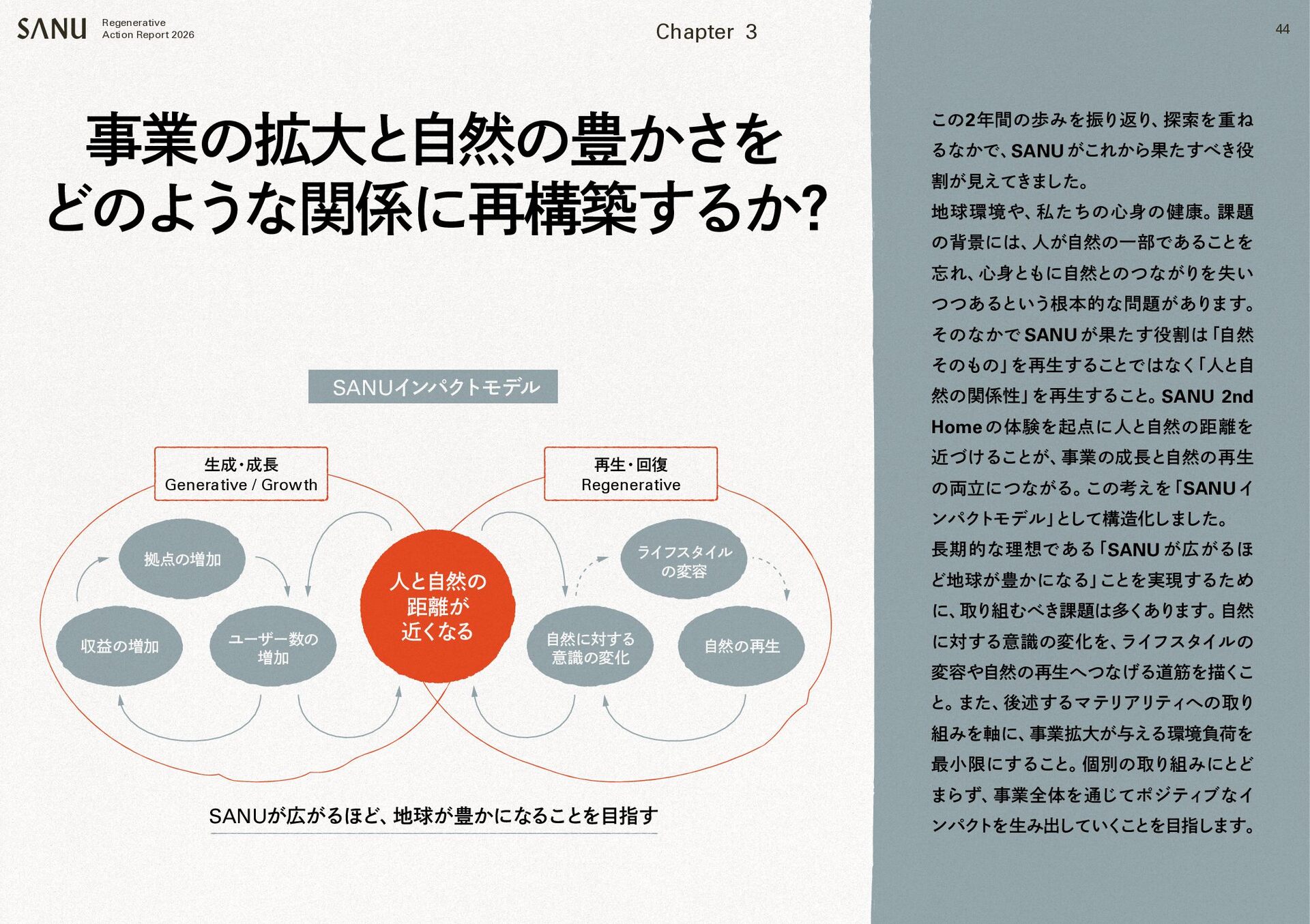 ぶ──かつて当たり前だったこうした自然 体験が、 いまでは多くの子どもたちの生活 から姿を消しつつある。 実際、 日本を含む 高所得国では、 登山や昆虫採集、 野鳥観 察といった体験を一度も経験したことがな い若者の割合が年々増えている*¹。 この 背景には、 都市化の進展、 身近な動植物 の減少、 そして子どもを取り巻く生活環境 の変化 (安全面に対する過度な配慮、 自由 時間の減少等) など、 さまざまな要因が複 雑に絡み合うと考えられている*²。 こうした、 人々が日常の中で自然とふれ あう機会を失っていく現象は 「経験の消失 (extinction of experience) 」 と呼ばれ る*²。 人類史を振り返れば、 時代の変化と ともに多くの経験が失われてきた──狩 猟や火起こ し、 星を頼りに方角を知る といっ た営みのように。 しかし、 それらの多くは 技術や文明の発展とともに不要となった 経験であり、 失われても大きな問題とはな らなかった。 だが、 自然とのかかわりの喪 失はそれらと異なる。 自然にふれる機会 を失うことは、 心身の健康やウェルビーイ ングに影響するだけでなく、 生物多様性 保全への関心や行動にも悪影響を及ぼす からだ*³。 最近の研究によれば、 自然に親しむ機 会が少ない人は、 精神的な健康状態が良 好でない傾向があり、 鬱症状や循環器 ・ 免 疫系への影響も報告されている。 この現 象は 「自然欠乏症候群」 とも呼ばれる。 ま た、 自然にふれる機会の少ない人は、 自然 に対する肯定的な感情や行動が減る一方 で、 過剰な恐怖や嫌悪感といったネガティ ブな態度を抱きやすく、 生態系の保全活 動に消極的になることも知られている。 つ まり、 経験の消失は個人の問題に留まら ず、 社会や地球規模の環境課題にもつな がる重要な問題なのである。 こうした影響が学術的に明らかになる につれ、 経験の消失をどう防ぐかが社会 的 ・ 学術的に大きな関心事となっている。 自然体験を増やすためには、 自然とふれ あう 「機会」 と 「意欲」 の両方を高めること が不可欠であり、 どのようにしてそれを実 現するかが課題となる。 この観点から見 れば、 SANU 2nd Home には大きな可 能性がある。 大自然に身を置くことが難し い現代人でも、 魅力的な場所で手軽に自 然にふれる体験を提供することで、 滞在 そのもののモチベーションを高め、 自然と の関わりを取り戻す助けになるからだ。 *1 Soga, M. & Gaston, K. J. (2023) Nature benefit hypothesis: Direct experiences of nature predict selfʖreported proʖbiodiversity behaviors. Conservation Letters, 16, e12945. *2 Soga, M. & Gaston, K. J. (2016) Extinction of experience: the loss of human–nature interactions. Frontiers in Ecology and the Environment, 14, 94-101. *3 Soga, M. & Gaston, K. J. (2022) Towards a unified understanding of human–nature interactions. Nature Sustainability, 5, 374-383. •寄稿 東京大学大学院 農学生命科学研究科/准教授 曽我昌史 2019年11月より現職。 専門は生態学だ が、 その他に環境心理学や都市計画学、 公衆衛生学にも精通し、 人と自然の相互 作用に関する学際的な研究に従事。 Regenerative Action Report 2026 34 Chapter 1