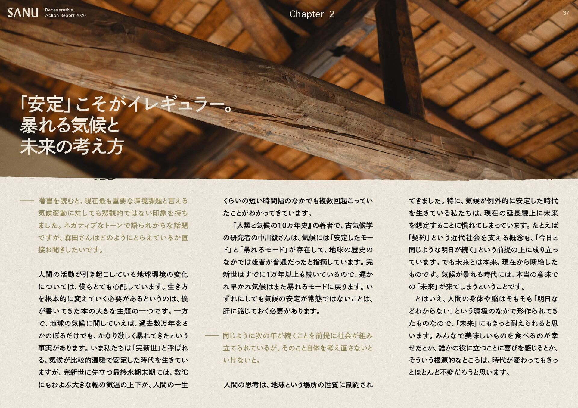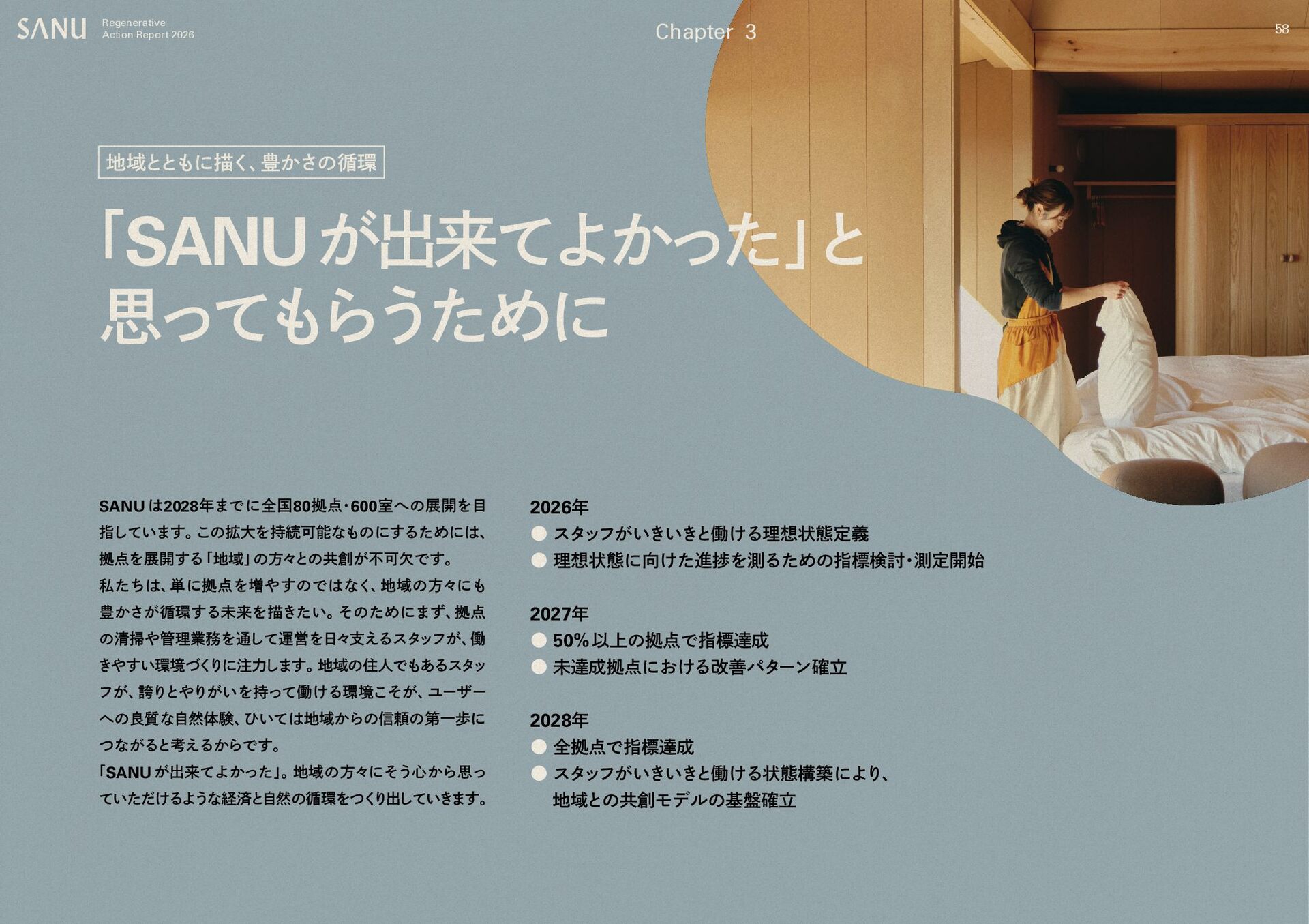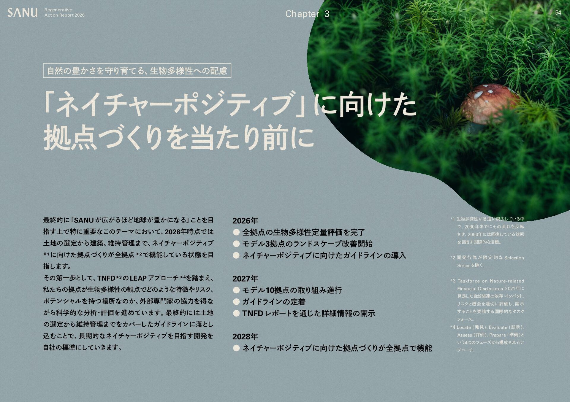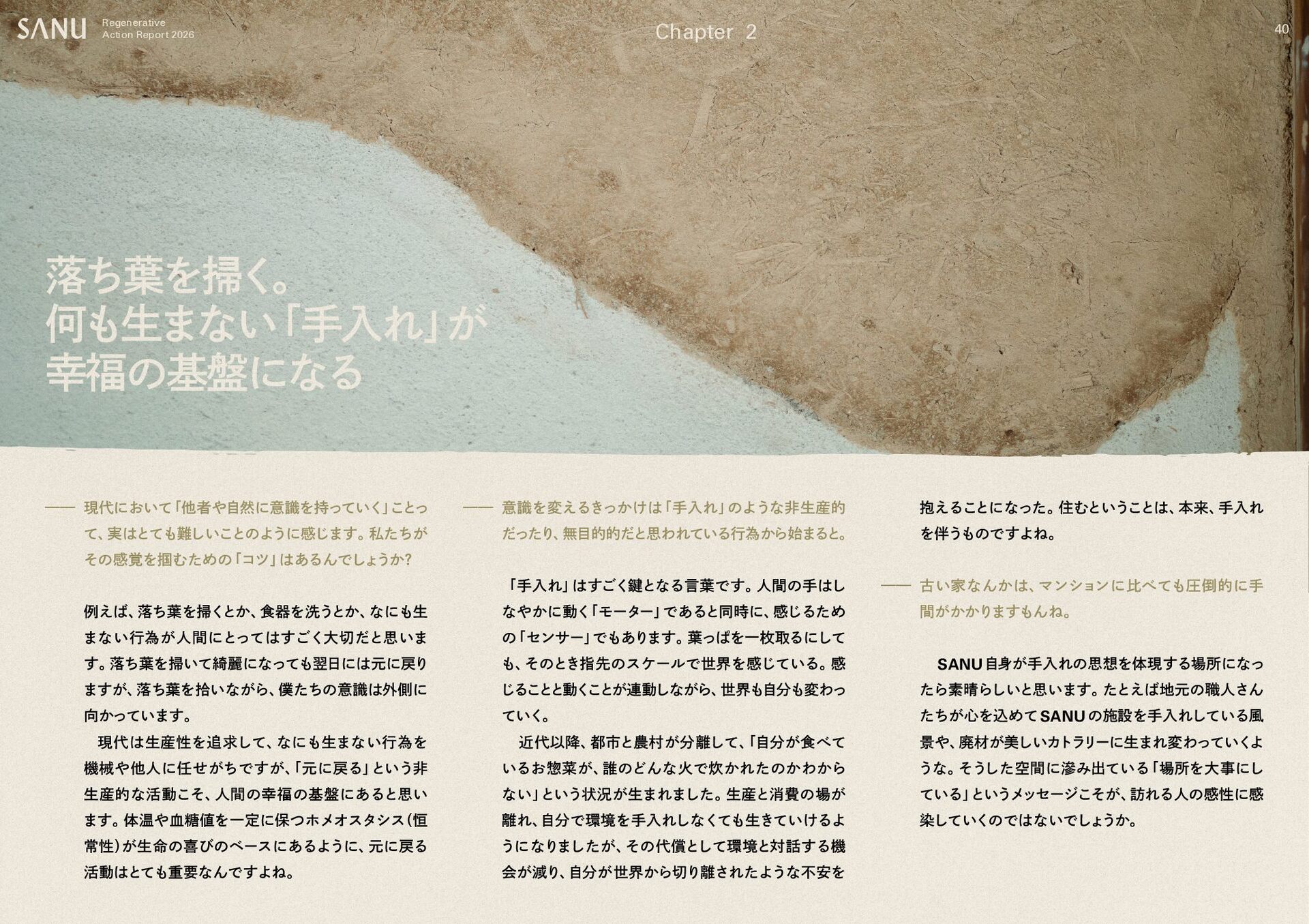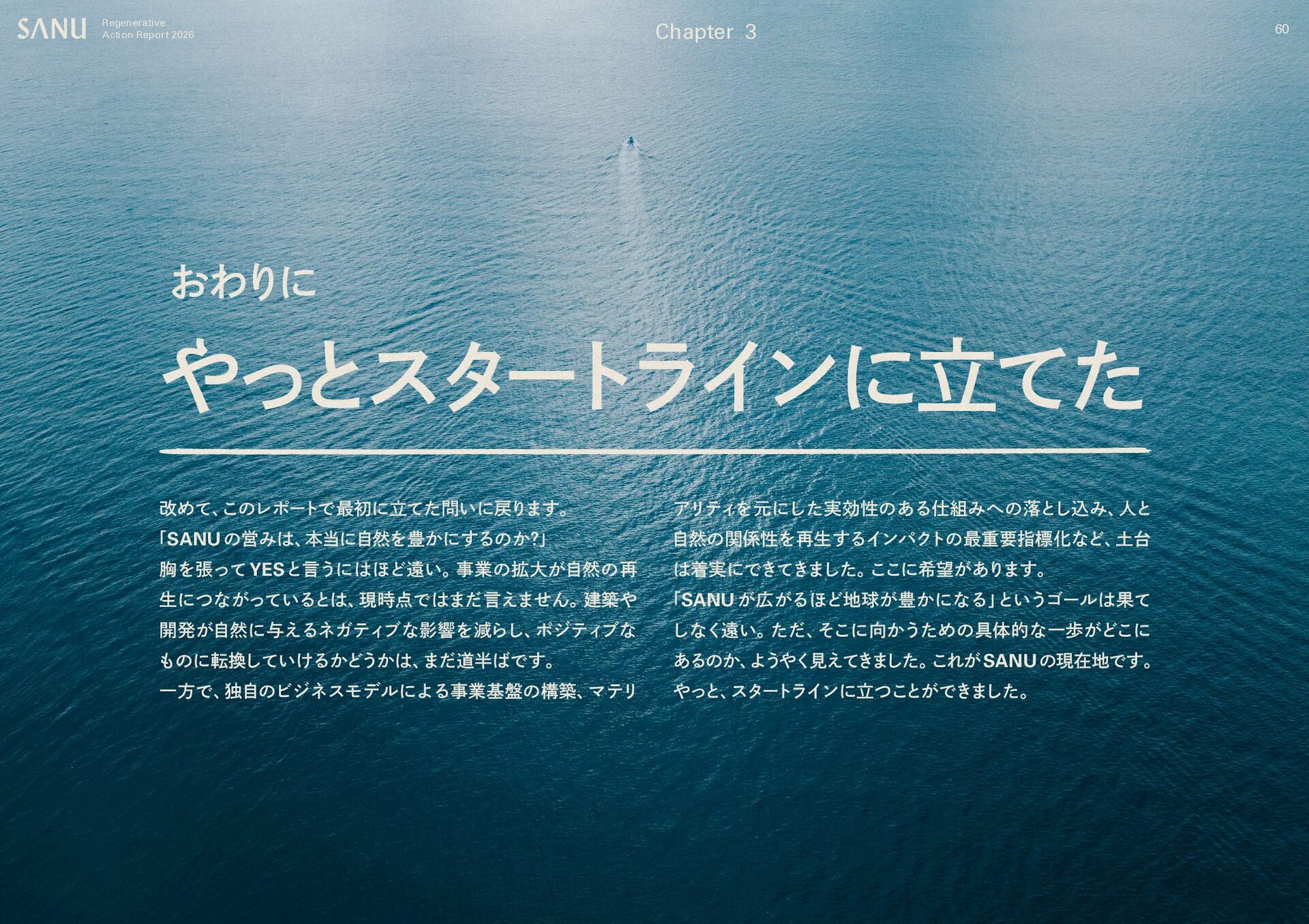 ぶ──かつて当たり前だったこうした自然 体験が、 いまでは多くの子どもたちの生活 から姿を消しつつある。 実際、 日本を含む 高所得国では、 登山や昆虫採集、 野鳥観 察といった体験を一度も経験したことがな い若者の割合が年々増えている*¹。 この 背景には、 都市化の進展、 身近な動植物 の減少、 そして子どもを取り巻く生活環境 の変化 (安全面に対する過度な配慮、 自由 時間の減少等) など、 さまざまな要因が複 雑に絡み合うと考えられている*²。 こうした、 人々が日常の中で自然とふれ あう機会を失っていく現象は 「経験の消失 (extinction of experience) 」 と呼ばれ る*²。 人類史を振り返れば、 時代の変化と ともに多くの経験が失われてきた──狩 猟や火起こ し、 星を頼りに方角を知る といっ た営みのように。 しかし、 それらの多くは 技術や文明の発展とともに不要となった 経験であり、 失われても大きな問題とはな らなかった。 だが、 自然とのかかわりの喪 失はそれらと異なる。 自然にふれる機会 を失うことは、 心身の健康やウェルビーイ ングに影響するだけでなく、 生物多様性 保全への関心や行動にも悪影響を及ぼす からだ*³。 最近の研究によれば、 自然に親しむ機 会が少ない人は、 精神的な健康状態が良 好でない傾向があり、 鬱症状や循環器 ・ 免 疫系への影響も報告されている。 この現 象は 「自然欠乏症候群」 とも呼ばれる。 ま た、 自然にふれる機会の少ない人は、 自然 に対する肯定的な感情や行動が減る一方 で、 過剰な恐怖や嫌悪感といったネガティ ブな態度を抱きやすく、 生態系の保全活 動に消極的になることも知られている。 つ まり、 経験の消失は個人の問題に留まら ず、 社会や地球規模の環境課題にもつな がる重要な問題なのである。 こうした影響が学術的に明らかになる につれ、 経験の消失をどう防ぐかが社会 的 ・ 学術的に大きな関心事となっている。 自然体験を増やすためには、 自然とふれ あう 「機会」 と 「意欲」 の両方を高めること が不可欠であり、 どのようにしてそれを実 現するかが課題となる。 この観点から見 れば、 SANU 2nd Home には大きな可 能性がある。 大自然に身を置くことが難し い現代人でも、 魅力的な場所で手軽に自 然にふれる体験を提供することで、 滞在 そのもののモチベーションを高め、 自然と の関わりを取り戻す助けになるからだ。 *1 Soga, M. & Gaston, K. J. (2023) Nature benefit hypothesis: Direct experiences of nature predict selfʖreported proʖbiodiversity behaviors. Conservation Letters, 16, e12945. *2 Soga, M. & Gaston, K. J. (2016) Extinction of experience: the loss of human–nature interactions. Frontiers in Ecology and the Environment, 14, 94-101. *3 Soga, M. & Gaston, K. J. (2022) Towards a unified understanding of human–nature interactions. Nature Sustainability, 5, 374-383. •寄稿 東京大学大学院 農学生命科学研究科/准教授 曽我昌史 2019年11月より現職。 専門は生態学だ が、 その他に環境心理学や都市計画学、 公衆衛生学にも精通し、 人と自然の相互 作用に関する学際的な研究に従事。 Regenerative Action Report 2026 34 Chapter 1