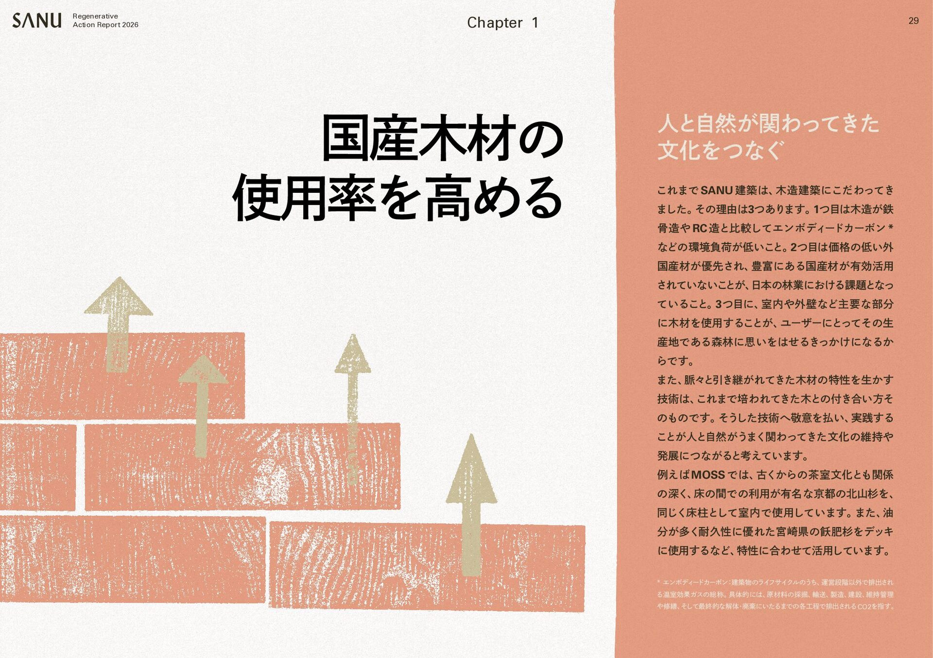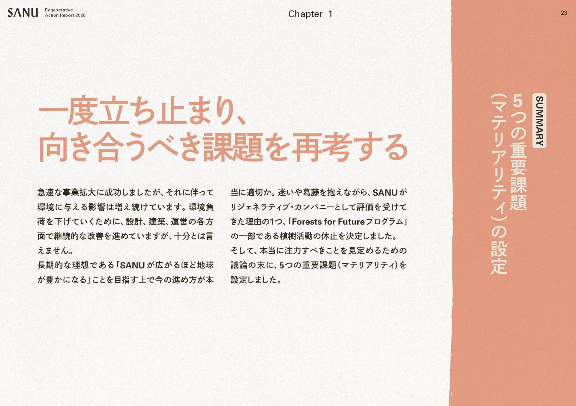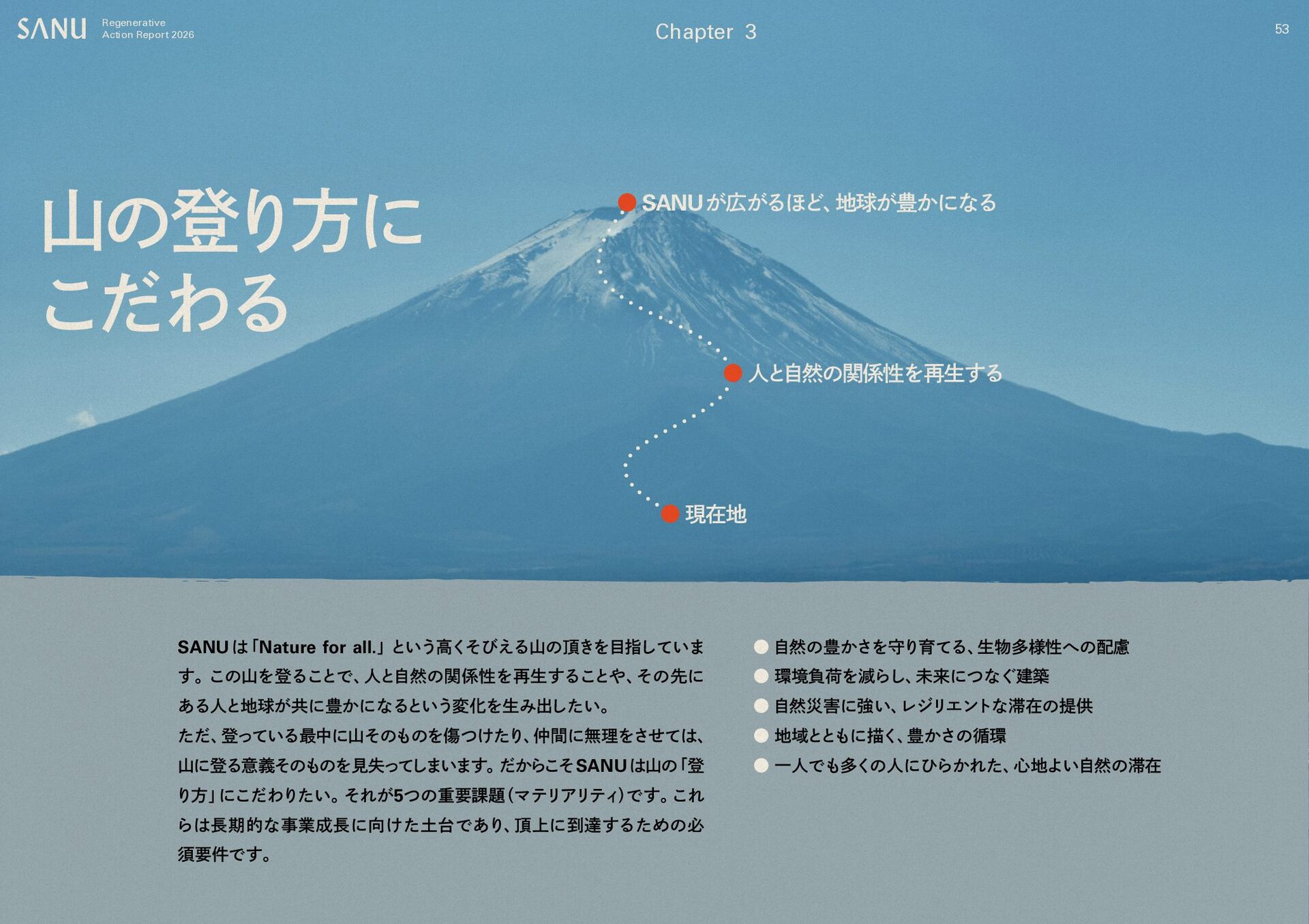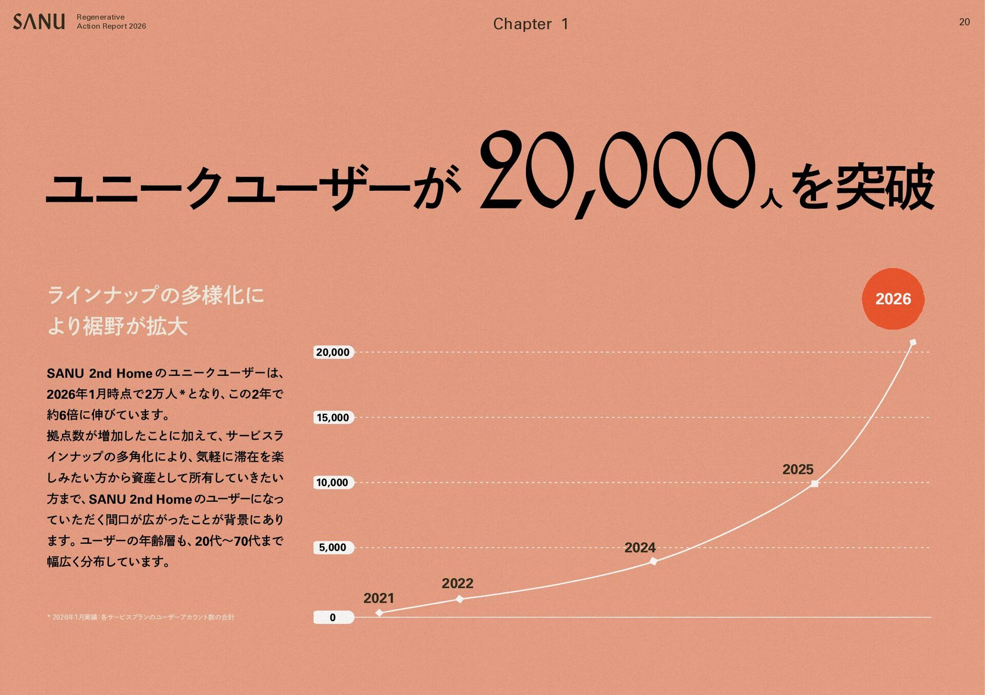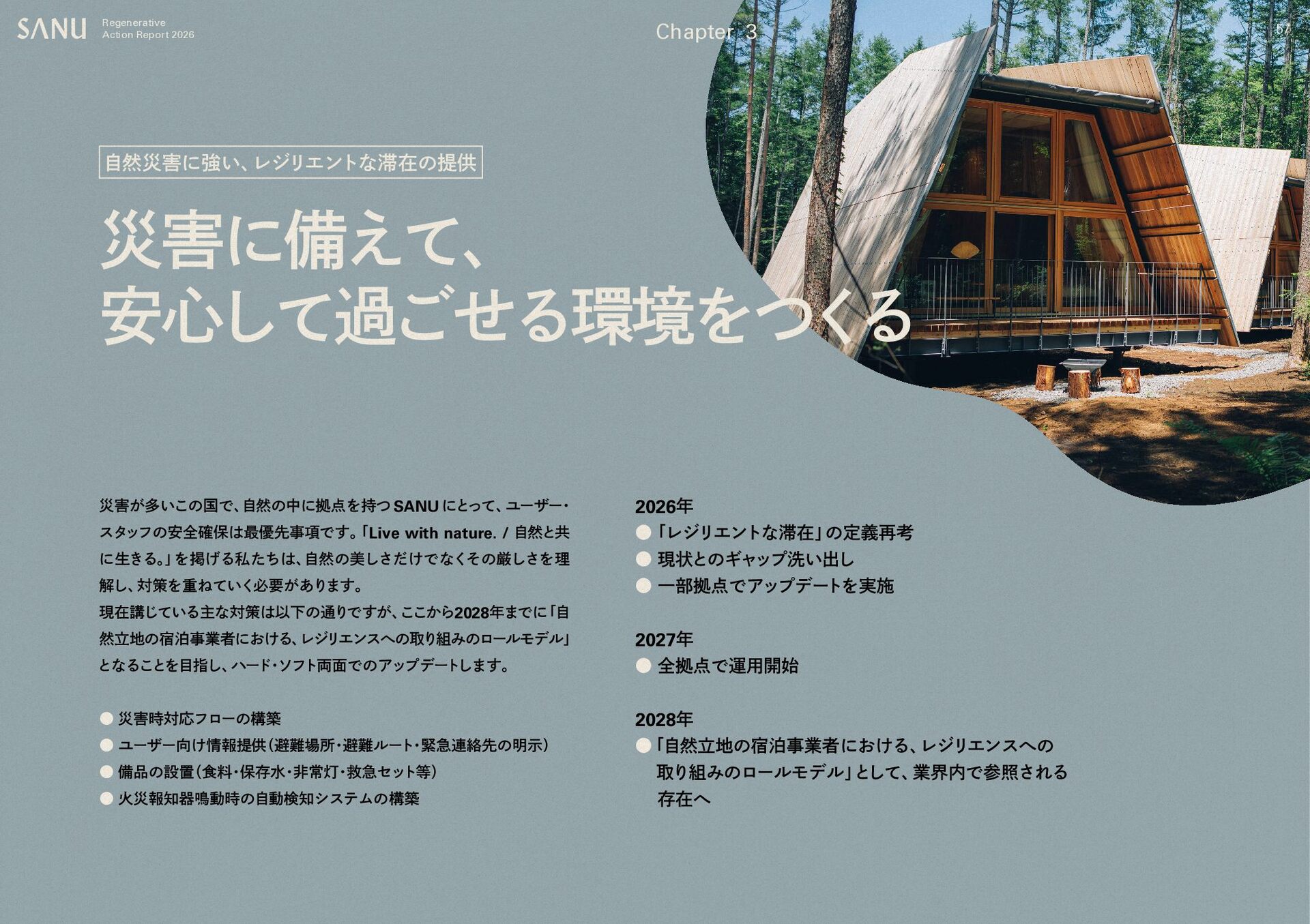 ぶ──かつて当たり前だったこうした自然 体験が、 いまでは多くの子どもたちの生活 から姿を消しつつある。 実際、 日本を含む 高所得国では、 登山や昆虫採集、 野鳥観 察といった体験を一度も経験したことがな い若者の割合が年々増えている*¹。 この 背景には、 都市化の進展、 身近な動植物 の減少、 そして子どもを取り巻く生活環境 の変化 (安全面に対する過度な配慮、 自由 時間の減少等) など、 さまざまな要因が複 雑に絡み合うと考えられている*²。 こうした、 人々が日常の中で自然とふれ あう機会を失っていく現象は 「経験の消失 (extinction of experience) 」 と呼ばれ る*²。 人類史を振り返れば、 時代の変化と ともに多くの経験が失われてきた──狩 猟や火起こ し、 星を頼りに方角を知る といっ た営みのように。 しかし、 それらの多くは 技術や文明の発展とともに不要となった 経験であり、 失われても大きな問題とはな らなかった。 だが、 自然とのかかわりの喪 失はそれらと異なる。 自然にふれる機会 を失うことは、 心身の健康やウェルビーイ ングに影響するだけでなく、 生物多様性 保全への関心や行動にも悪影響を及ぼす からだ*³。 最近の研究によれば、 自然に親しむ機 会が少ない人は、 精神的な健康状態が良 好でない傾向があり、 鬱症状や循環器 ・ 免 疫系への影響も報告されている。 この現 象は 「自然欠乏症候群」 とも呼ばれる。 ま た、 自然にふれる機会の少ない人は、 自然 に対する肯定的な感情や行動が減る一方 で、 過剰な恐怖や嫌悪感といったネガティ ブな態度を抱きやすく、 生態系の保全活 動に消極的になることも知られている。 つ まり、 経験の消失は個人の問題に留まら ず、 社会や地球規模の環境課題にもつな がる重要な問題なのである。 こうした影響が学術的に明らかになる につれ、 経験の消失をどう防ぐかが社会 的 ・ 学術的に大きな関心事となっている。 自然体験を増やすためには、 自然とふれ あう 「機会」 と 「意欲」 の両方を高めること が不可欠であり、 どのようにしてそれを実 現するかが課題となる。 この観点から見 れば、 SANU 2nd Home には大きな可 能性がある。 大自然に身を置くことが難し い現代人でも、 魅力的な場所で手軽に自 然にふれる体験を提供することで、 滞在 そのもののモチベーションを高め、 自然と の関わりを取り戻す助けになるからだ。 *1 Soga, M. & Gaston, K. J. (2023) Nature benefit hypothesis: Direct experiences of nature predict selfʖreported proʖbiodiversity behaviors. Conservation Letters, 16, e12945. *2 Soga, M. & Gaston, K. J. (2016) Extinction of experience: the loss of human–nature interactions. Frontiers in Ecology and the Environment, 14, 94-101. *3 Soga, M. & Gaston, K. J. (2022) Towards a unified understanding of human–nature interactions. Nature Sustainability, 5, 374-383. •寄稿 東京大学大学院 農学生命科学研究科/准教授 曽我昌史 2019年11月より現職。 専門は生態学だ が、 その他に環境心理学や都市計画学、 公衆衛生学にも精通し、 人と自然の相互 作用に関する学際的な研究に従事。 Regenerative Action Report 2026 34 Chapter 1