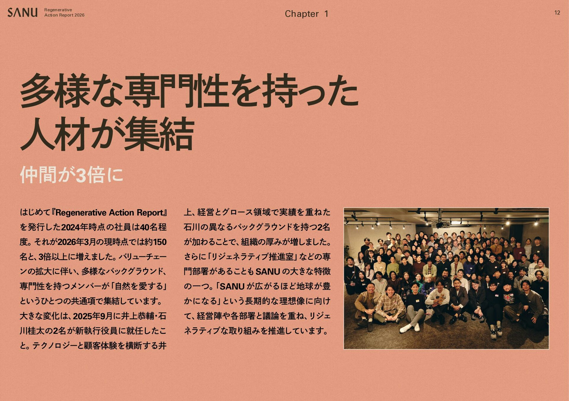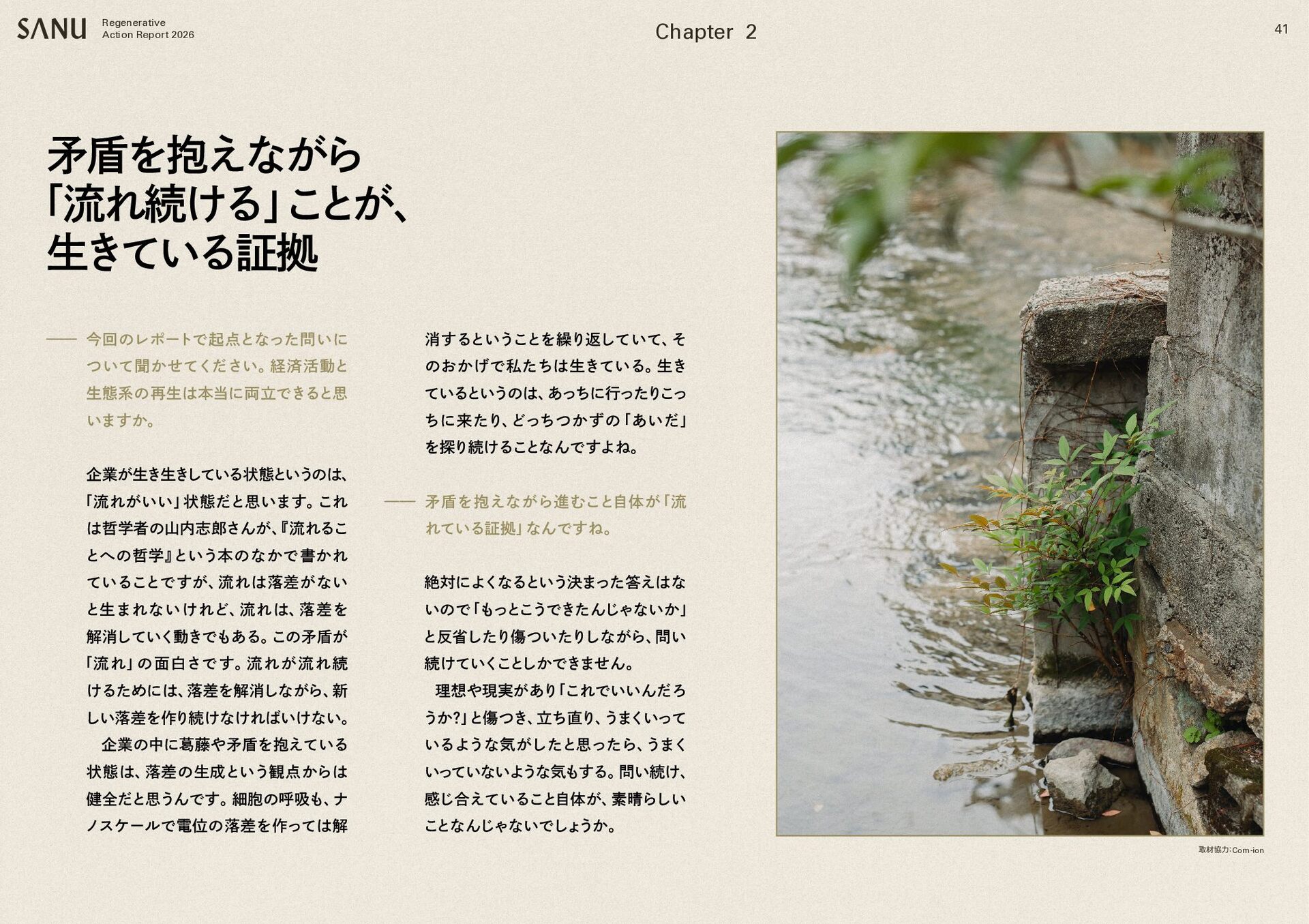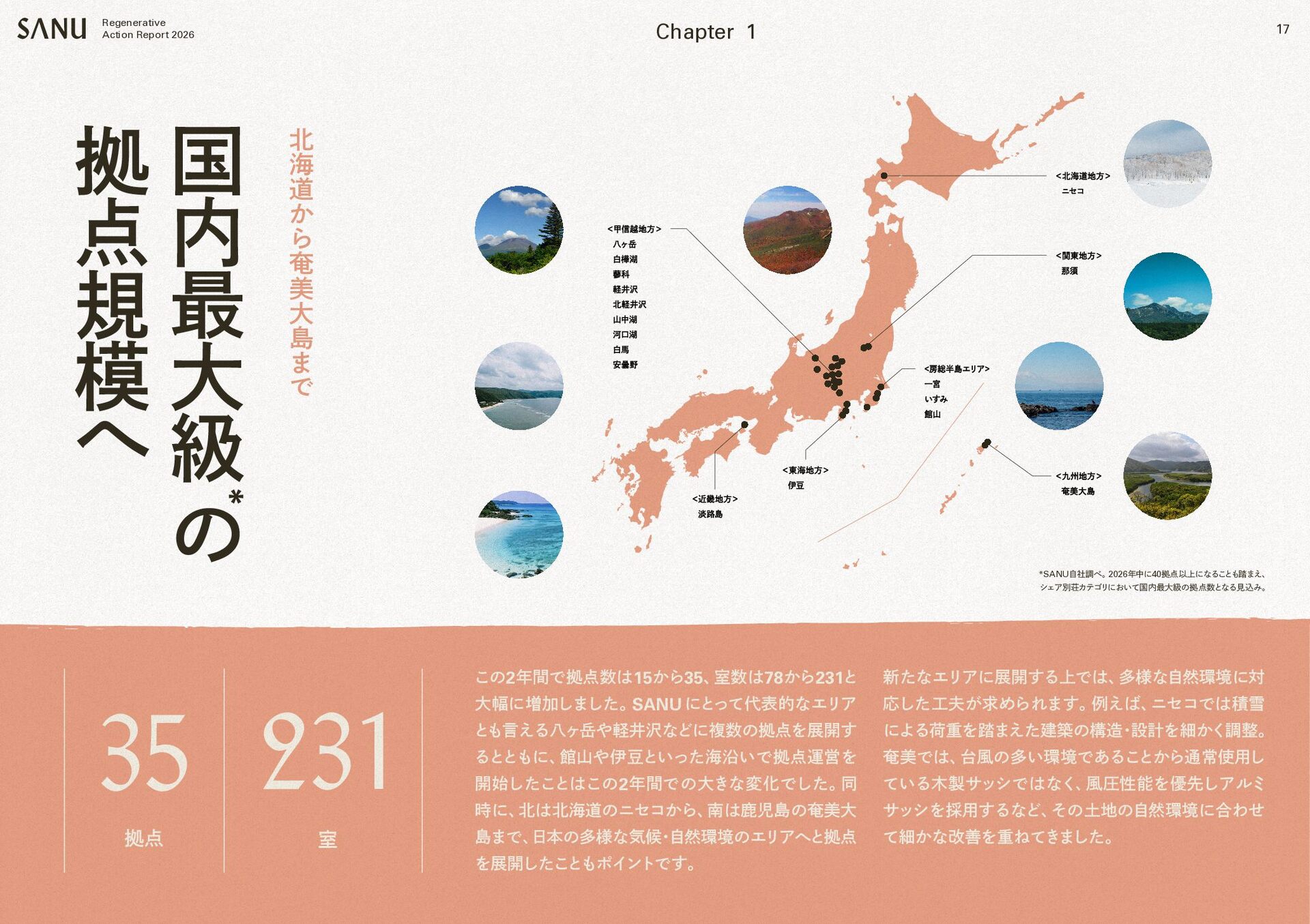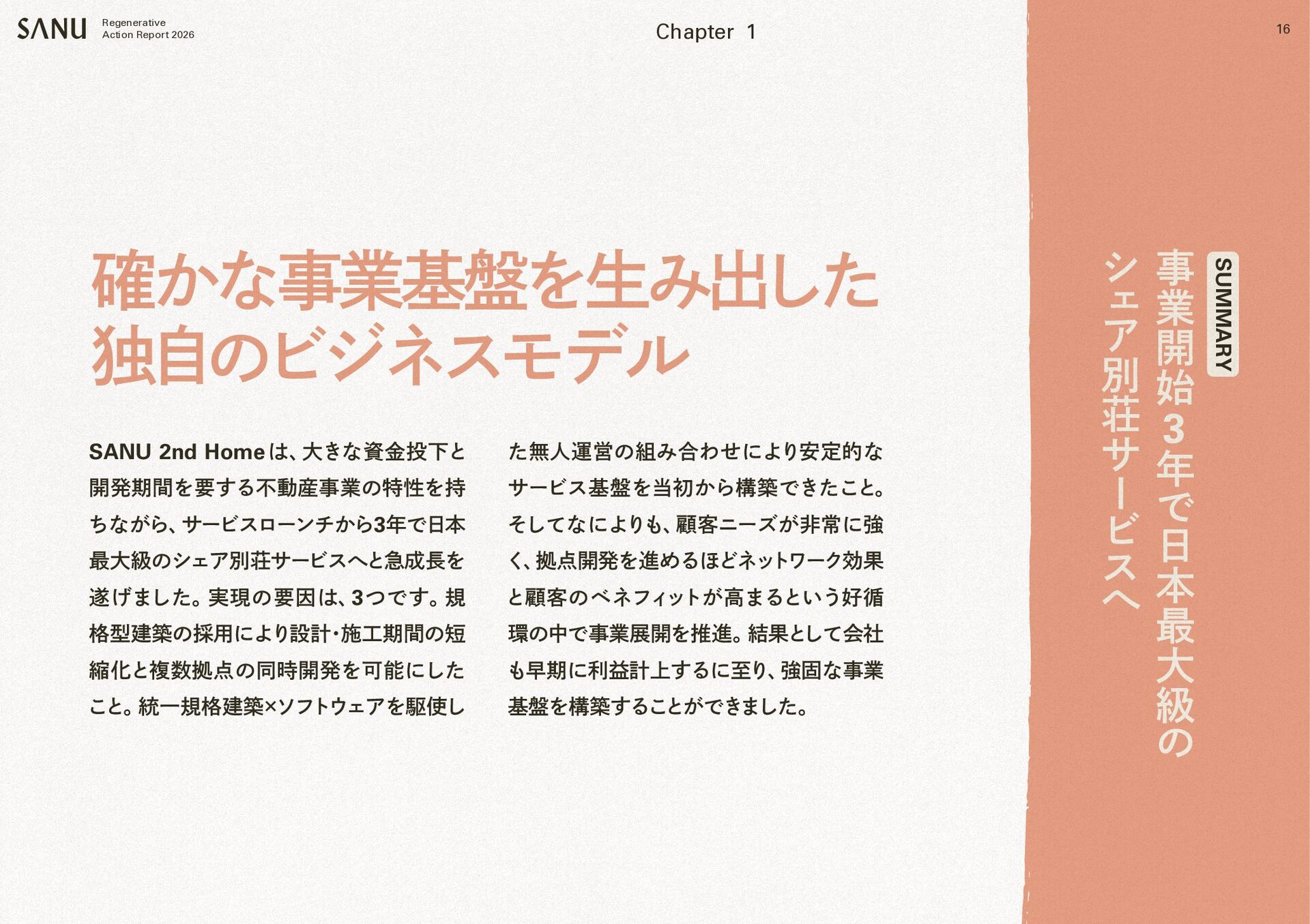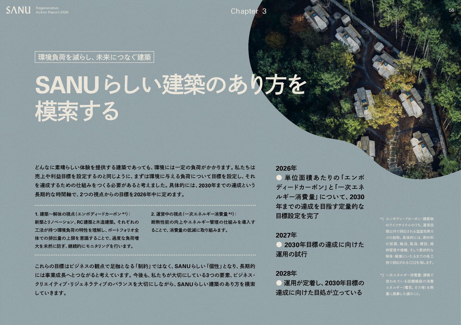 ぶ──かつて当たり前だったこうした自然 体験が、 いまでは多くの子どもたちの生活 から姿を消しつつある。 実際、 日本を含む 高所得国では、 登山や昆虫採集、 野鳥観 察といった体験を一度も経験したことがな い若者の割合が年々増えている*¹。 この 背景には、 都市化の進展、 身近な動植物 の減少、 そして子どもを取り巻く生活環境 の変化 (安全面に対する過度な配慮、 自由 時間の減少等) など、 さまざまな要因が複 雑に絡み合うと考えられている*²。 こうした、 人々が日常の中で自然とふれ あう機会を失っていく現象は 「経験の消失 (extinction of experience) 」 と呼ばれ る*²。 人類史を振り返れば、 時代の変化と ともに多くの経験が失われてきた──狩 猟や火起こ し、 星を頼りに方角を知る といっ た営みのように。 しかし、 それらの多くは 技術や文明の発展とともに不要となった 経験であり、 失われても大きな問題とはな らなかった。 だが、 自然とのかかわりの喪 失はそれらと異なる。 自然にふれる機会 を失うことは、 心身の健康やウェルビーイ ングに影響するだけでなく、 生物多様性 保全への関心や行動にも悪影響を及ぼす からだ*³。 最近の研究によれば、 自然に親しむ機 会が少ない人は、 精神的な健康状態が良 好でない傾向があり、 鬱症状や循環器 ・ 免 疫系への影響も報告されている。 この現 象は 「自然欠乏症候群」 とも呼ばれる。 ま た、 自然にふれる機会の少ない人は、 自然 に対する肯定的な感情や行動が減る一方 で、 過剰な恐怖や嫌悪感といったネガティ ブな態度を抱きやすく、 生態系の保全活 動に消極的になることも知られている。 つ まり、 経験の消失は個人の問題に留まら ず、 社会や地球規模の環境課題にもつな がる重要な問題なのである。 こうした影響が学術的に明らかになる につれ、 経験の消失をどう防ぐかが社会 的 ・ 学術的に大きな関心事となっている。 自然体験を増やすためには、 自然とふれ あう 「機会」 と 「意欲」 の両方を高めること が不可欠であり、 どのようにしてそれを実 現するかが課題となる。 この観点から見 れば、 SANU 2nd Home には大きな可 能性がある。 大自然に身を置くことが難し い現代人でも、 魅力的な場所で手軽に自 然にふれる体験を提供することで、 滞在 そのもののモチベーションを高め、 自然と の関わりを取り戻す助けになるからだ。 *1 Soga, M. & Gaston, K. J. (2023) Nature benefit hypothesis: Direct experiences of nature predict selfʖreported proʖbiodiversity behaviors. Conservation Letters, 16, e12945. *2 Soga, M. & Gaston, K. J. (2016) Extinction of experience: the loss of human–nature interactions. Frontiers in Ecology and the Environment, 14, 94-101. *3 Soga, M. & Gaston, K. J. (2022) Towards a unified understanding of human–nature interactions. Nature Sustainability, 5, 374-383. •寄稿 東京大学大学院 農学生命科学研究科/准教授 曽我昌史 2019年11月より現職。 専門は生態学だ が、 その他に環境心理学や都市計画学、 公衆衛生学にも精通し、 人と自然の相互 作用に関する学際的な研究に従事。 Regenerative Action Report 2026 34 Chapter 1