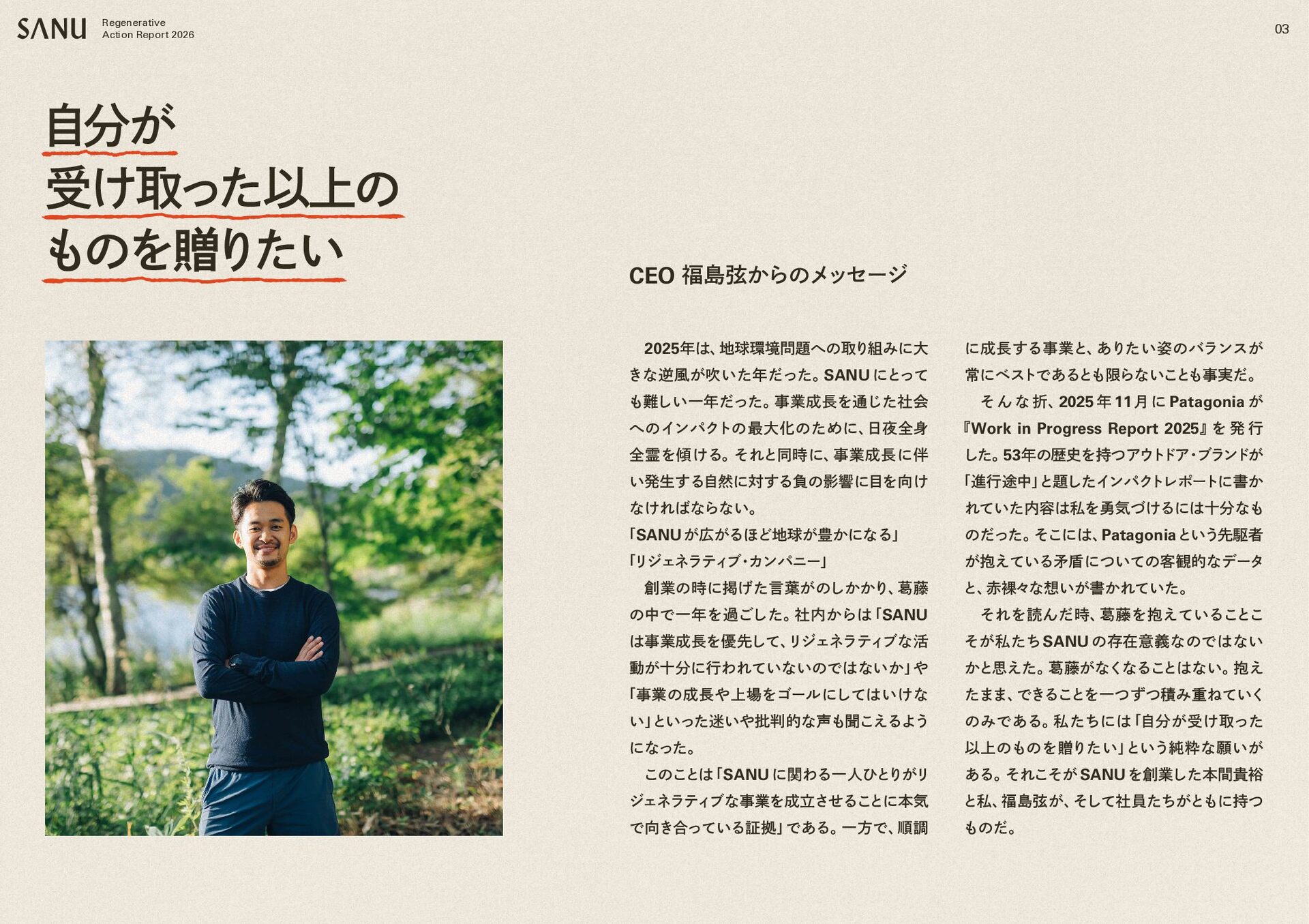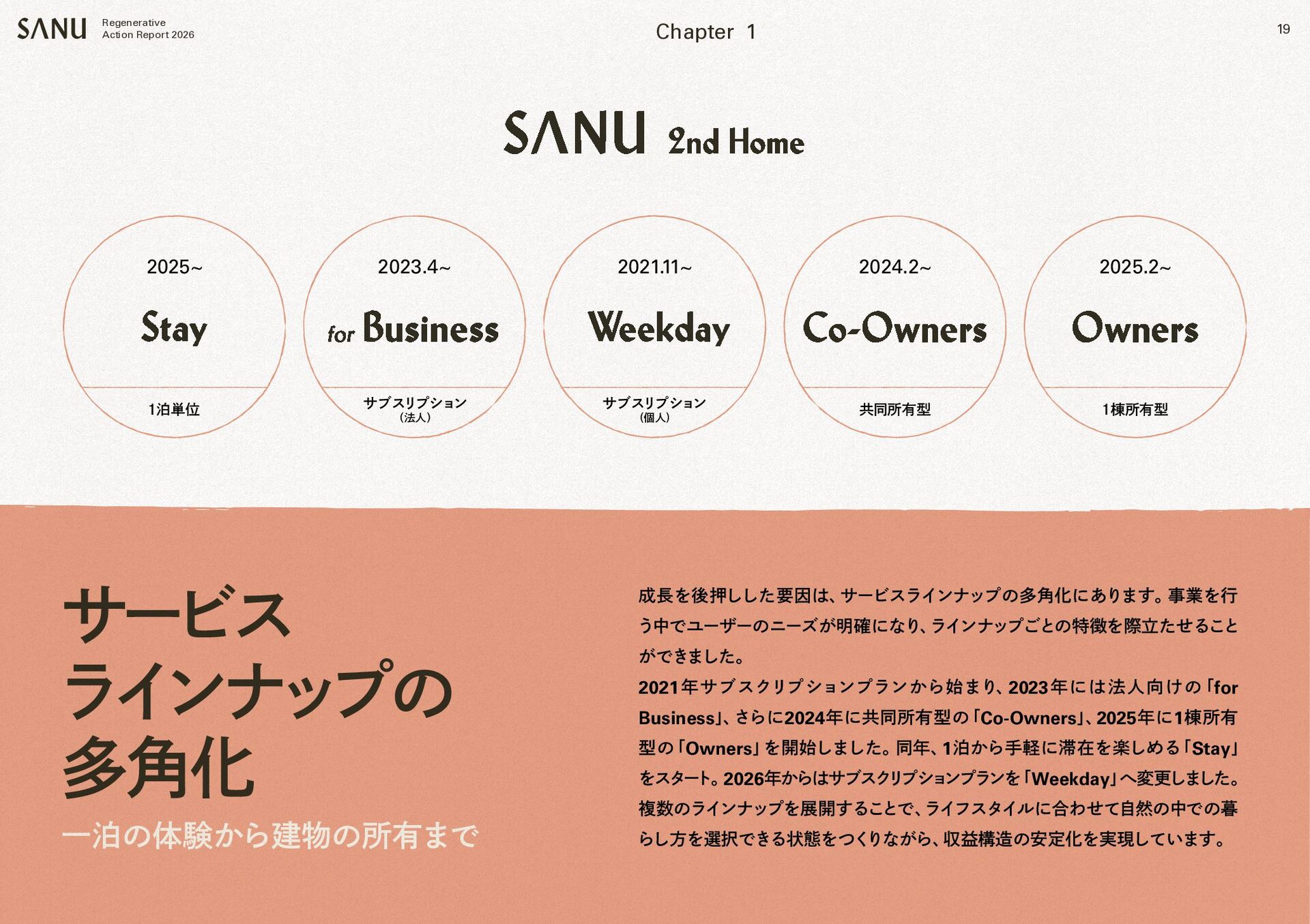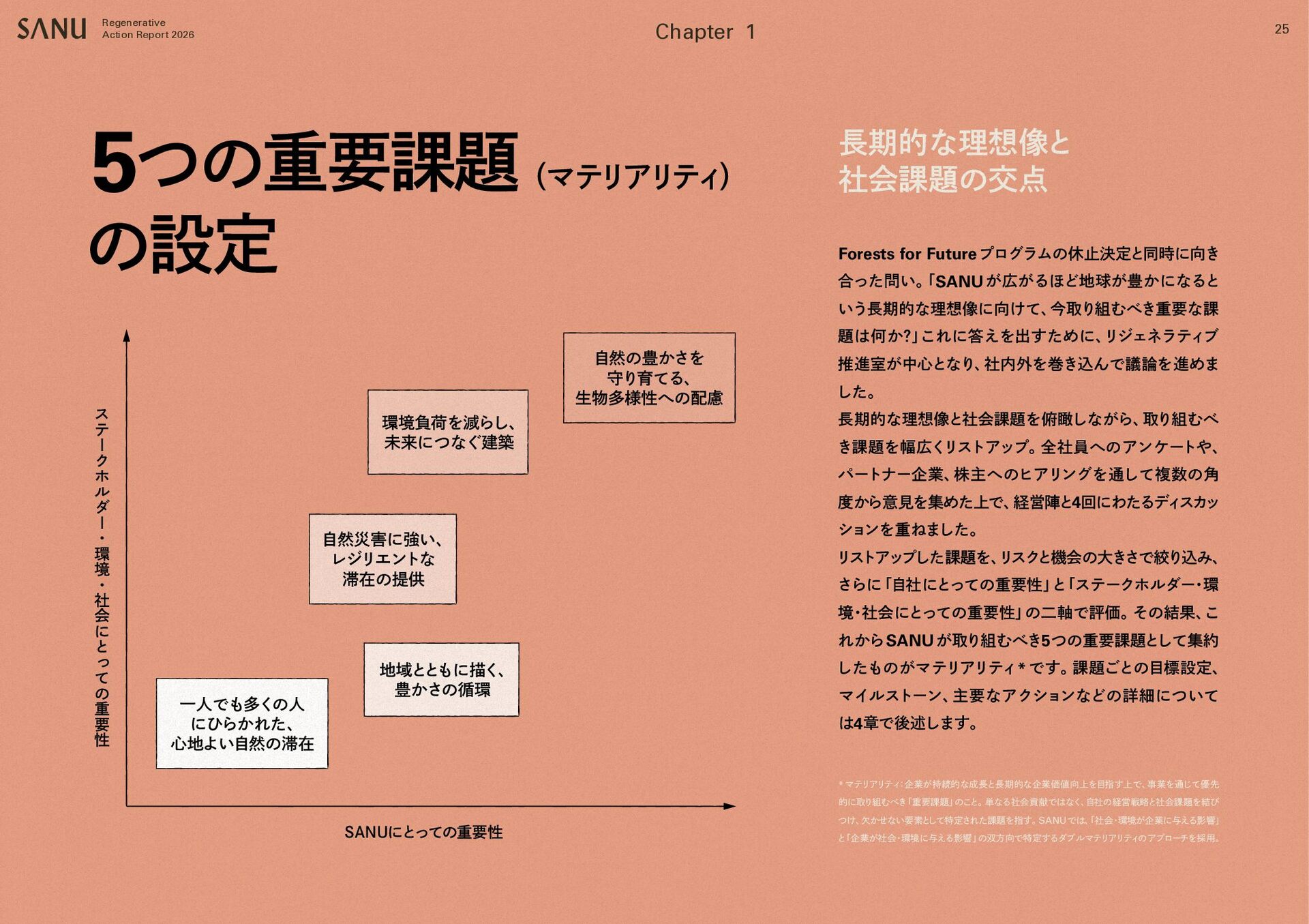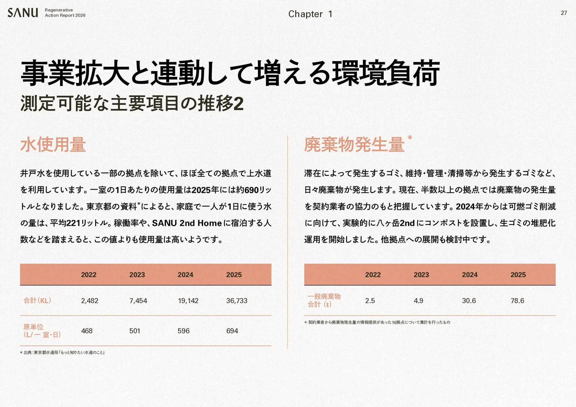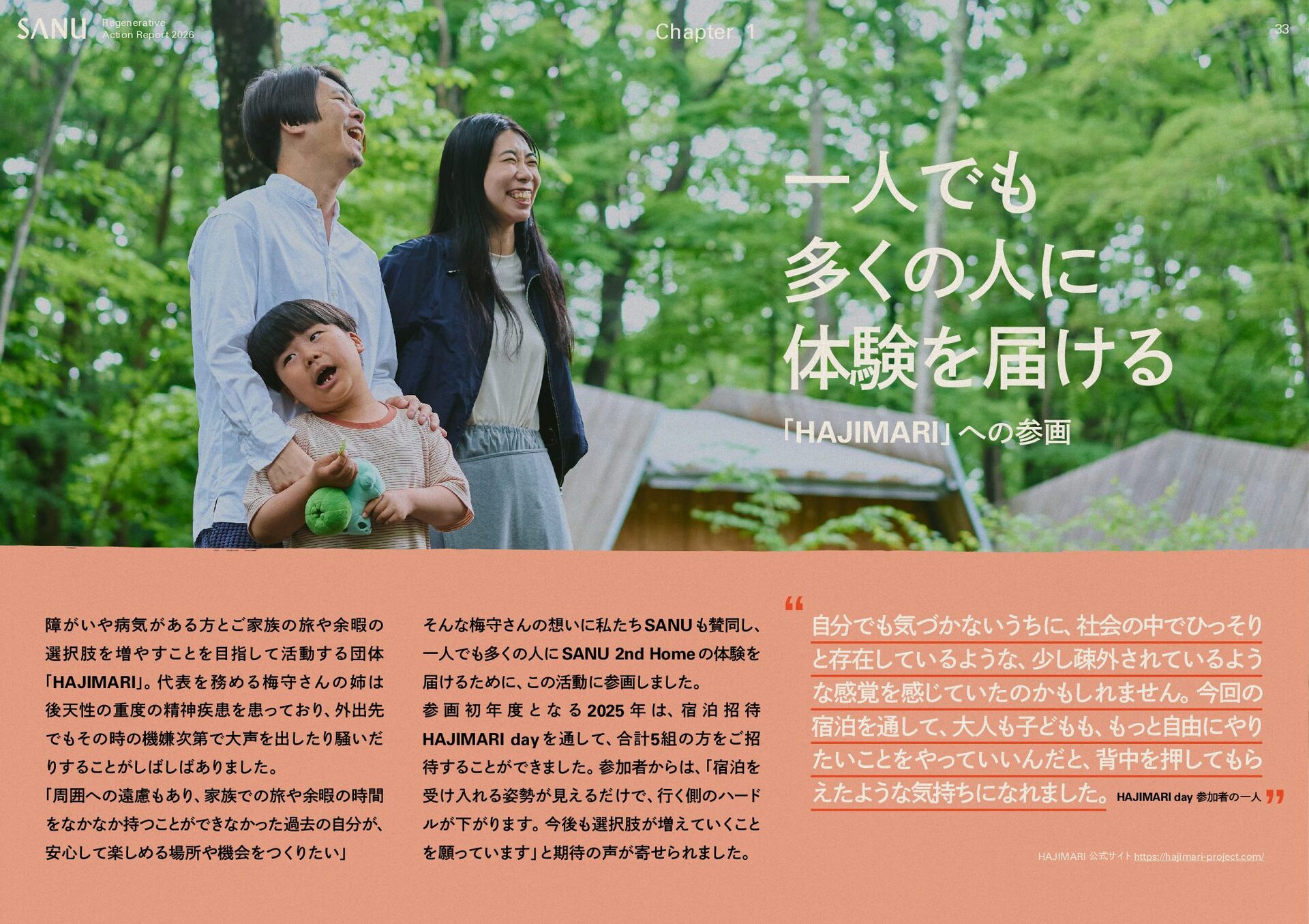 ぶ──かつて当たり前だったこうした自然 体験が、 いまでは多くの子どもたちの生活 から姿を消しつつある。 実際、 日本を含む 高所得国では、 登山や昆虫採集、 野鳥観 察といった体験を一度も経験したことがな い若者の割合が年々増えている*¹。 この 背景には、 都市化の進展、 身近な動植物 の減少、 そして子どもを取り巻く生活環境 の変化 (安全面に対する過度な配慮、 自由 時間の減少等) など、 さまざまな要因が複 雑に絡み合うと考えられている*²。 こうした、 人々が日常の中で自然とふれ あう機会を失っていく現象は 「経験の消失 (extinction of experience) 」 と呼ばれ る*²。 人類史を振り返れば、 時代の変化と ともに多くの経験が失われてきた──狩 猟や火起こ し、 星を頼りに方角を知る といっ た営みのように。 しかし、 それらの多くは 技術や文明の発展とともに不要となった 経験であり、 失われても大きな問題とはな らなかった。 だが、 自然とのかかわりの喪 失はそれらと異なる。 自然にふれる機会 を失うことは、 心身の健康やウェルビーイ ングに影響するだけでなく、 生物多様性 保全への関心や行動にも悪影響を及ぼす からだ*³。 最近の研究によれば、 自然に親しむ機 会が少ない人は、 精神的な健康状態が良 好でない傾向があり、 鬱症状や循環器 ・ 免 疫系への影響も報告されている。 この現 象は 「自然欠乏症候群」 とも呼ばれる。 ま た、 自然にふれる機会の少ない人は、 自然 に対する肯定的な感情や行動が減る一方 で、 過剰な恐怖や嫌悪感といったネガティ ブな態度を抱きやすく、 生態系の保全活 動に消極的になることも知られている。 つ まり、 経験の消失は個人の問題に留まら ず、 社会や地球規模の環境課題にもつな がる重要な問題なのである。 こうした影響が学術的に明らかになる につれ、 経験の消失をどう防ぐかが社会 的 ・ 学術的に大きな関心事となっている。 自然体験を増やすためには、 自然とふれ あう 「機会」 と 「意欲」 の両方を高めること が不可欠であり、 どのようにしてそれを実 現するかが課題となる。 この観点から見 れば、 SANU 2nd Home には大きな可 能性がある。 大自然に身を置くことが難し い現代人でも、 魅力的な場所で手軽に自 然にふれる体験を提供することで、 滞在 そのもののモチベーションを高め、 自然と の関わりを取り戻す助けになるからだ。 *1 Soga, M. & Gaston, K. J. (2023) Nature benefit hypothesis: Direct experiences of nature predict selfʖreported proʖbiodiversity behaviors. Conservation Letters, 16, e12945. *2 Soga, M. & Gaston, K. J. (2016) Extinction of experience: the loss of human–nature interactions. Frontiers in Ecology and the Environment, 14, 94-101. *3 Soga, M. & Gaston, K. J. (2022) Towards a unified understanding of human–nature interactions. Nature Sustainability, 5, 374-383. •寄稿 東京大学大学院 農学生命科学研究科/准教授 曽我昌史 2019年11月より現職。 専門は生態学だ が、 その他に環境心理学や都市計画学、 公衆衛生学にも精通し、 人と自然の相互 作用に関する学際的な研究に従事。 Regenerative Action Report 2026 34 Chapter 1