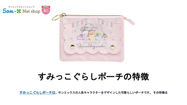 すみっこぐらしポーチの特徴には、キャラクターたちの愛らしいデザインと優れた機能性が共存しています。コンパクトながらも使い勝手抜群なデザインは、日常の小物整理や旅行時のお供に最適。高品質な素材と細部へのこだわりが光るポーチで、すみっこぐらしの世界観を身近に感じながら、快適でスタイリッシュなライフスタイルをお楽しみください。