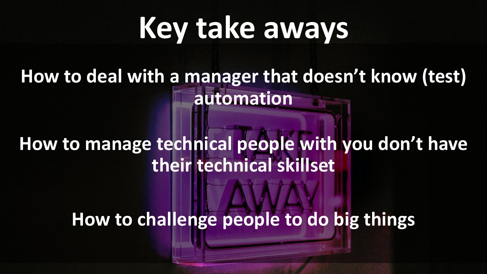 doesn’t know (test) automation How to manage technical people with you don’t have their technical skillset How to challenge people to do big things