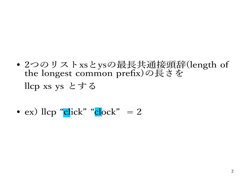 2 • 2つのリストxsとysの最長共通接頭辞(length of the longest common prefix)の長さを llcp xs