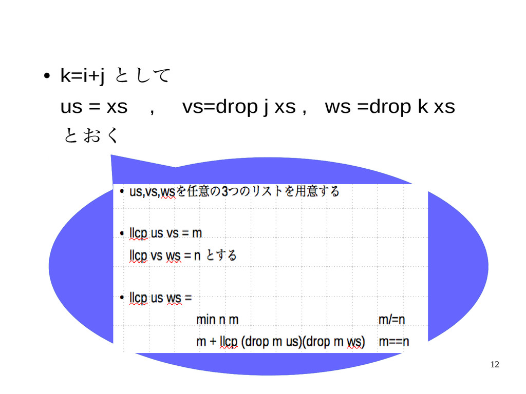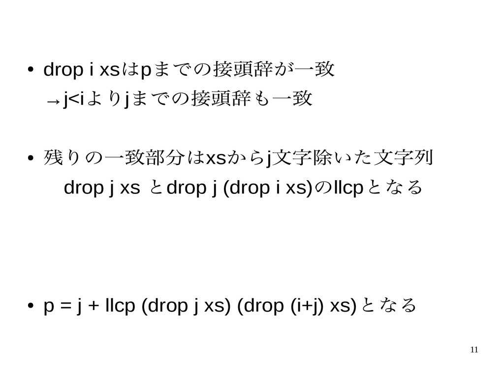11 • drop i xsはpまでの接頭辞が一致 →j<iよりjまでの接頭辞も一致 • 残りの一致部分はxsからj文字除いた文字列 drop j