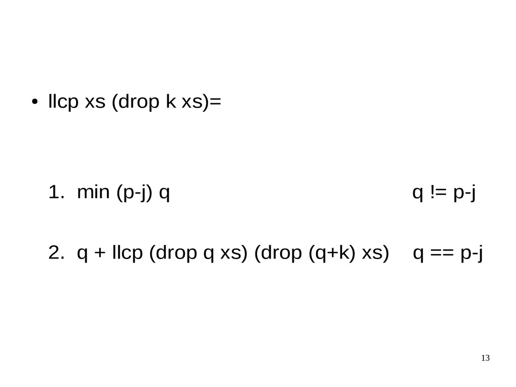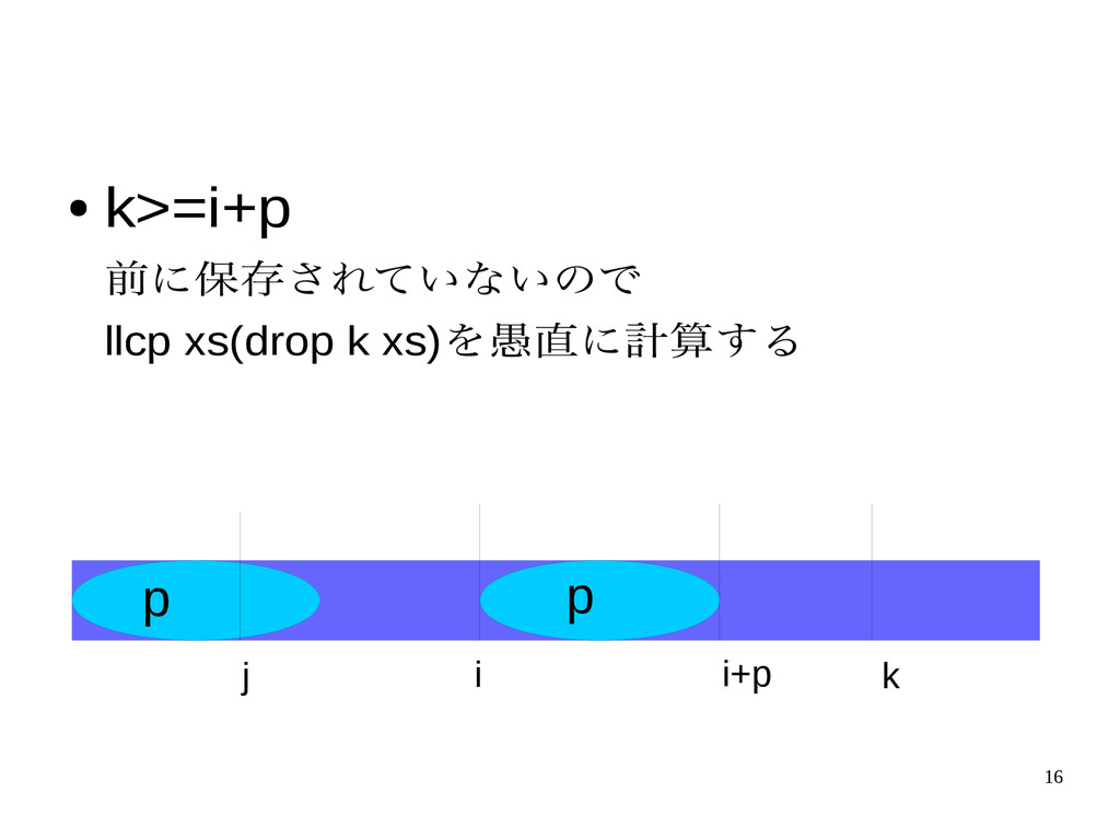 16 • k>=i+p 前に保存されていないので llcp xs(drop k xs)を愚直に計算する j i