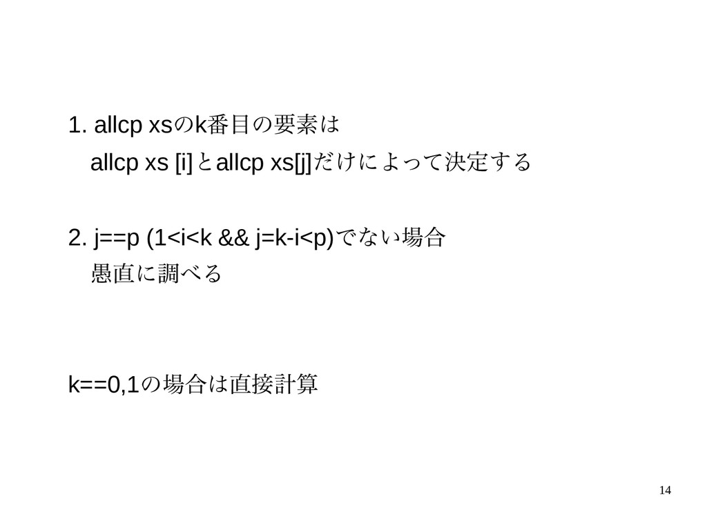14 1. allcp xsのk番目の要素は allcp xs [i]とallcp xs[j]だけによって決定する 2. j==p