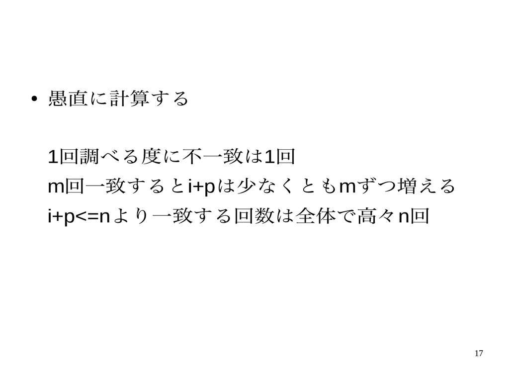 17 • 愚直に計算する 1回調べる度に不一致は1回 m回一致するとi+pは少なくともmずつ増える i+p<=nより一致する回数は全体で高々n回