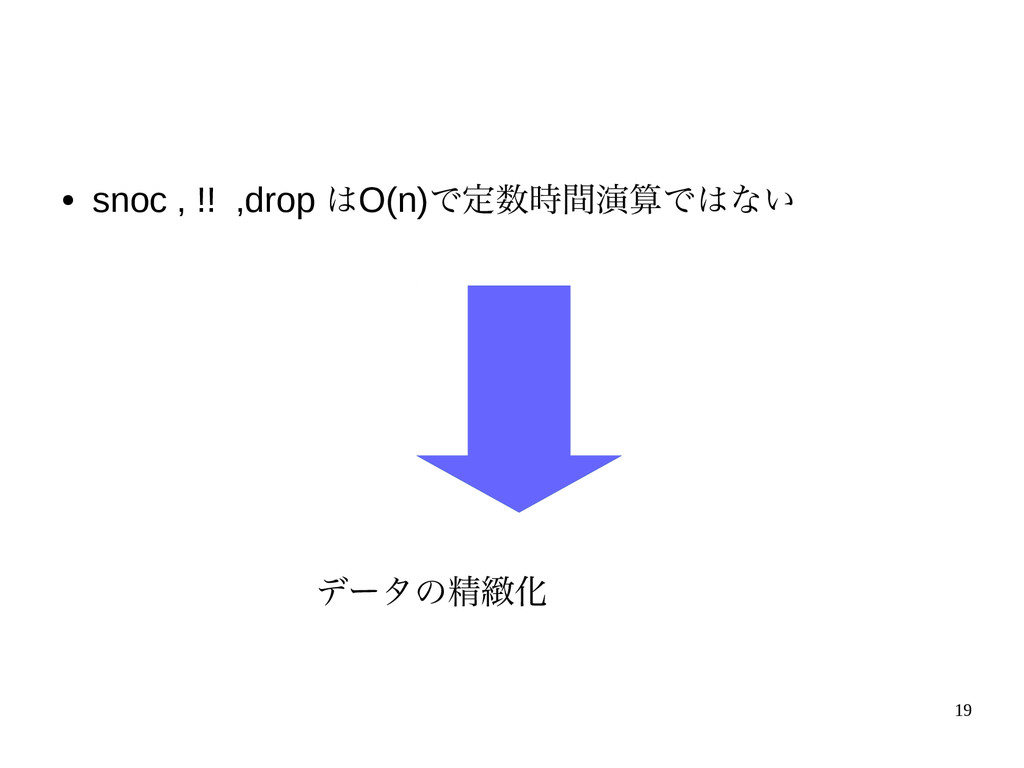 19 • snoc , !! ,drop はO(n)で定数時間演算ではない データの精緻化