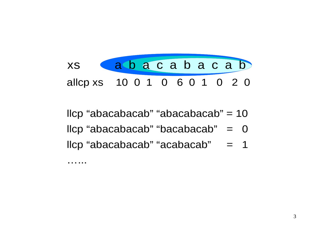 a b allcp xs 10 0 1 0 6 0 1 0 2 0 llcp “abacabacab” “abacabacab” = 10 llcp “abacabacab” “bacabacab” = 0 llcp “abacabacab” “acabacab” = 1 …...