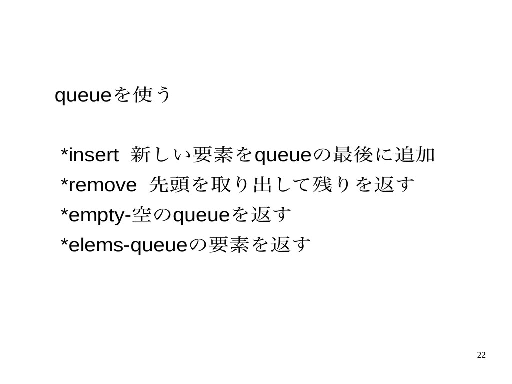 22 queueを使う *insert 新しい要素をqueueの最後に追加 *remove 先頭を取り出して残りを返す *empty-空のqueueを返す *elems-queueの要素を返す