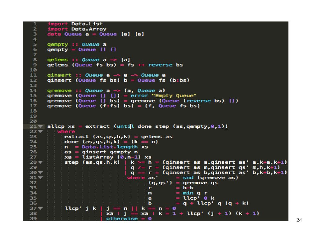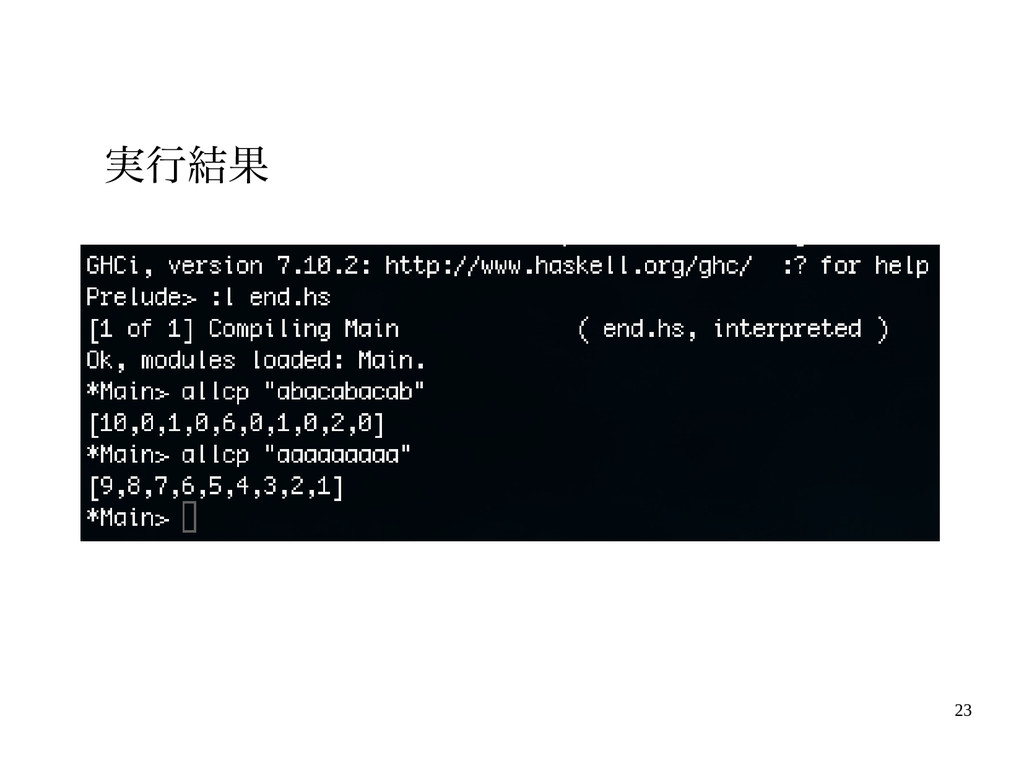 20 • drop Haskell配列ライブラリのData.Array を使ってllcpを書き換える • snoc HaskellのData.Sequenceライブラリを使う リストO(n)を配列に