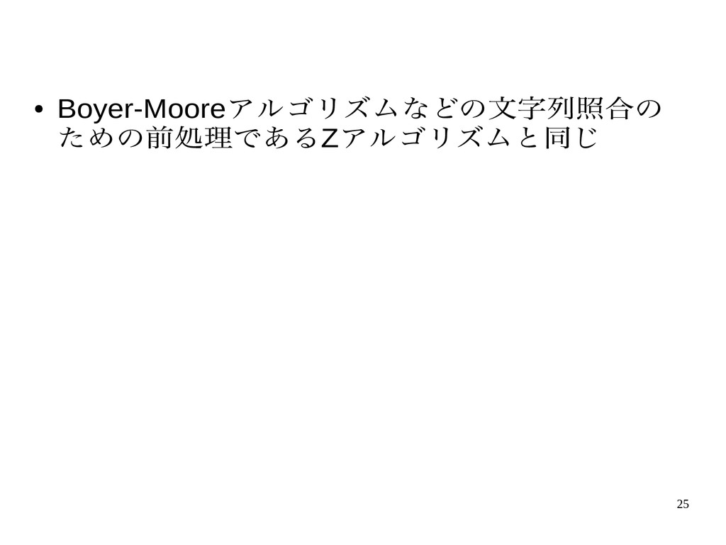 25 • Boyer-Mooreアルゴリズムなどの文字列照合の ための前処理であるZアルゴリズムと同じ