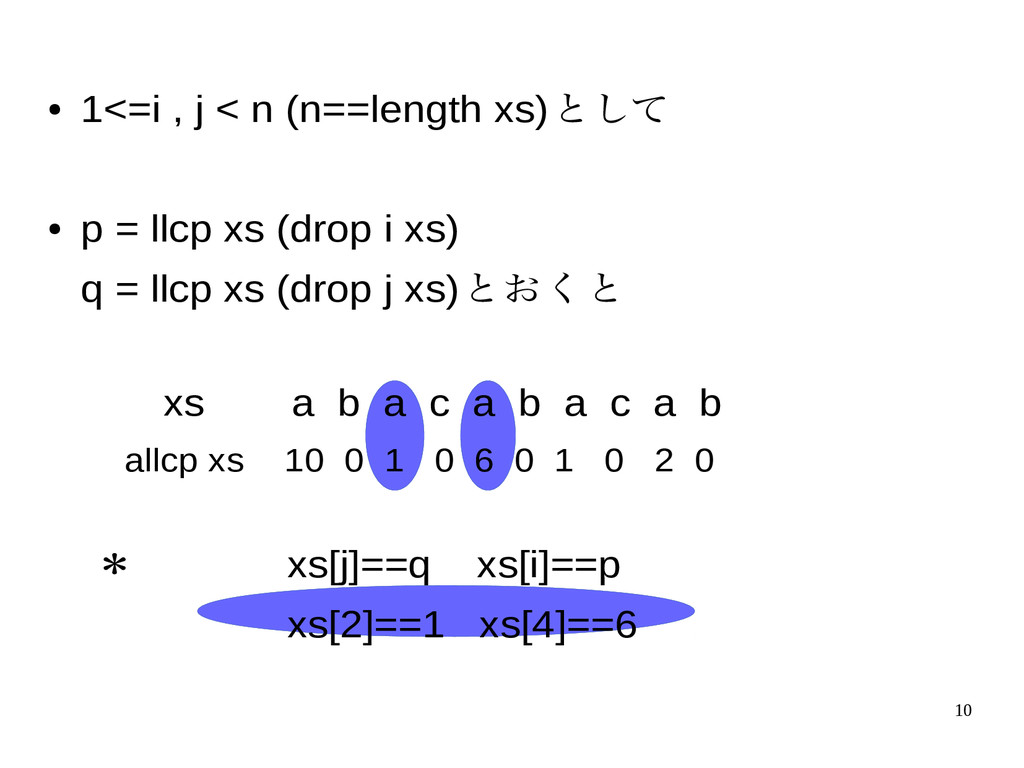 p = llcp xs (drop i xs) q = llcp xs (drop j xs)とおくと xs a b a c a b a c a b allcp xs 10 0 1 0 6 0 1 0 2 0 * xs[j]==q xs[i]==p xs[2]==1 xs[4]==6