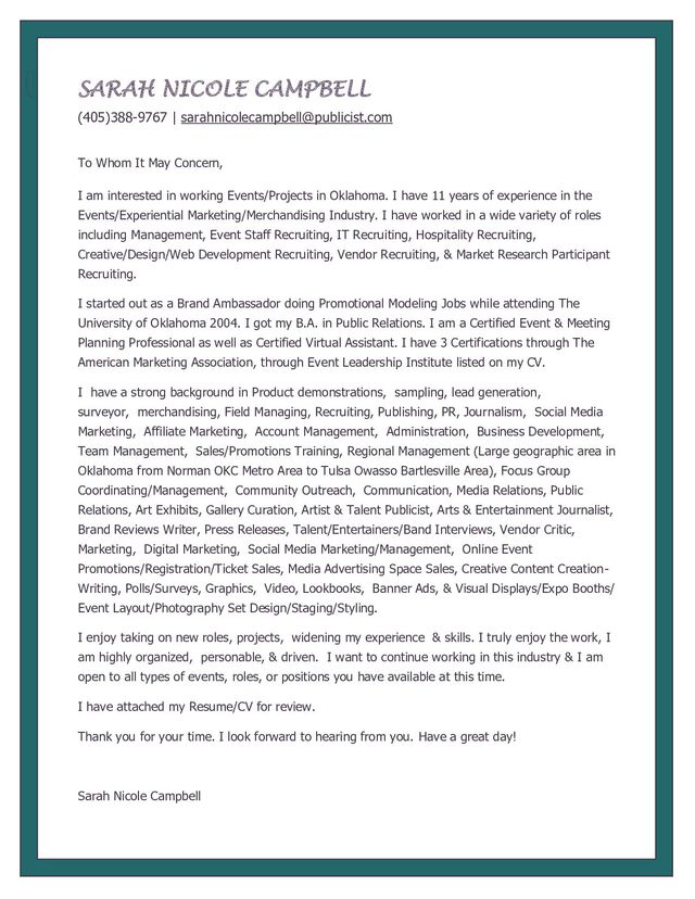 Concern, I am interested in working Events/Projects in Oklahoma. I have 11 years of experience in the Events/Experiential Marketing/Merchandising Industry. I have worked in a wide variety of roles including Management, Event Staff Recruiting, IT Recruiting, Hospitality Recruiting, Creative/Design/Web Development Recruiting, Vendor Recruiting, & Market Research Participant Recruiting. I started out as a Brand Ambassador doing Promotional Modeling Jobs while attending The University of Oklahoma 2004. I got my B.A. in Public Relations. I am a Certified Event & Meeting Planning Professional as well as Certified Virtual Assistant. I have 3 Certifications through The American Marketing Association, through Event Leadership Institute listed on my CV. I have a strong background in Product demonstrations, sampling, lead generation, surveyor, merchandising, Field Managing, Recruiting, Publishing, PR, Journalism, Social Media Marketing, Affiliate Marketing, Account Management, Administration, Business Development, Team Management, Sales/Promotions Training, Regional Management (Large geographic area in Oklahoma from Norman OKC Metro Area to Tulsa Owasso Bartlesville Area), Focus Group Coordinating/Management, Community Outreach, Communication, Media Relations, Public Relations, Art Exhibits, Gallery Curation, Artist & Talent Publicist, Arts & Entertainment Journalist, Brand Reviews Writer, Press Releases, Talent/Entertainers/Band Interviews, Vendor Critic, Marketing, Digital Marketing, Social Media Marketing/Management, Online Event Promotions/Registration/Ticket Sales, Media Advertising Space Sales, Creative Content Creation- Writing, Polls/Surveys, Graphics, Video, Lookbooks, Banner Ads, & Visual Displays/Expo Booths/ Event Layout/Photography Set Design/Staging/Styling. I enjoy taking on new roles, projects, widening my experience & skills. I truly enjoy the work, I am highly organized, personable, & driven. I want to continue working in this industry & I am open to all types of events, roles, or positions you have available at this time. I have attached my Resume/CV for review. Thank you for your time. I look forward to hearing from you. Have a great day! Sarah Nicole Campbell