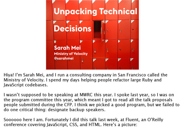Right now, your team might be struggling to organize the client-side parts of your application. Ember? Angular? Backbone? Flip a coin? Uh…which one has the most…retweets? These choices don’t need to be arbitrary or based on vague personal preference. Come learn a more useful and realistic approach that makes large-scale technical decisions less risky.