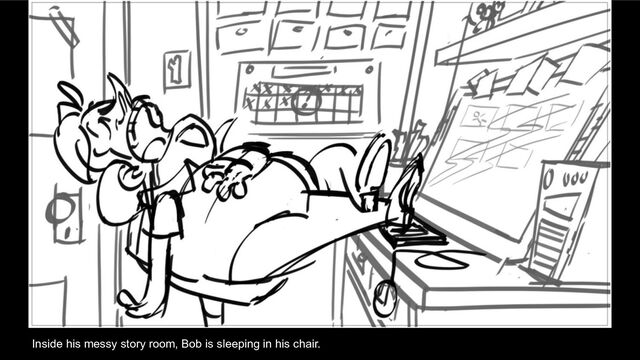 Inside his messy story room, Bob is sleeping in his