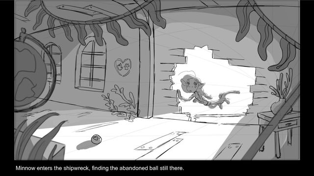 Minnow enters the shipwreck, finding the abandoned ball still there.