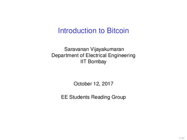 • Nodes which want to perform transactions broadcast them Block Header Number of Transactions n Coinbase Transaction Regular Transaction 1 Regular Transaction 2 . . . Regular Transaction n − 1 nVersion hashPrevBlock hashMerkleRoot nTime nBits nNonce h = H(h0 h1) h0 = H(h00 h01) h00 = H(t0) t0 h01 = H(t1) t1 h1 = H(h10 h10) h10 = H(t2) t2 h10 • Miners collect some of these transactions into a candidate block • hashPrevBlock and hashMerkleRoot fields populated • hashMerkleRoot is root hash of transaction Merkle tree • nBits encodes a 256-bit target value T, say T = 0x 00 · · · 00 16 times FFFFF · · · FFFFF 48 times • Miner who can find nNonce such that SHA256 (SHA256 (nVersion HashPrevBlock . . . nNonce)) ≤ T can add a new block 9 / 27