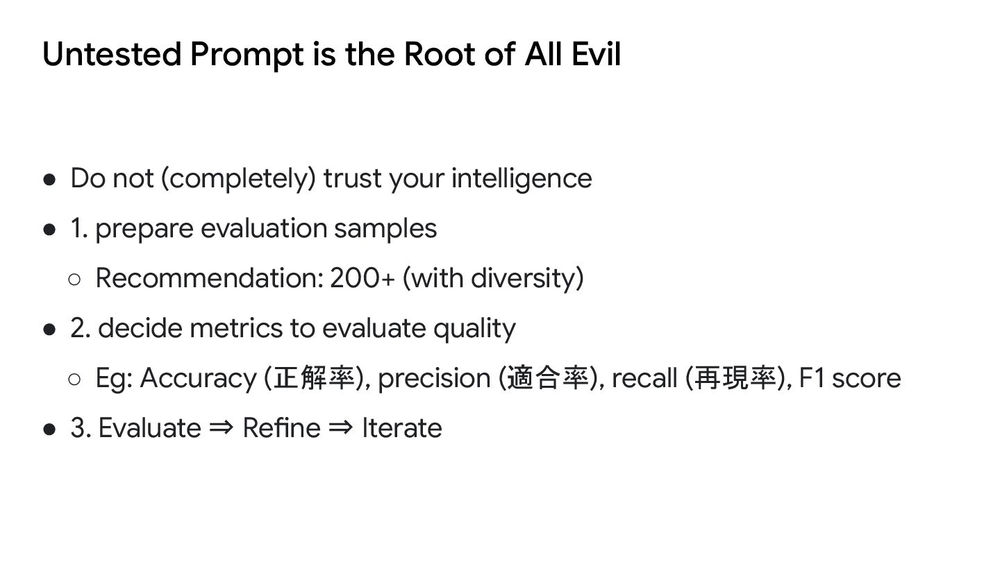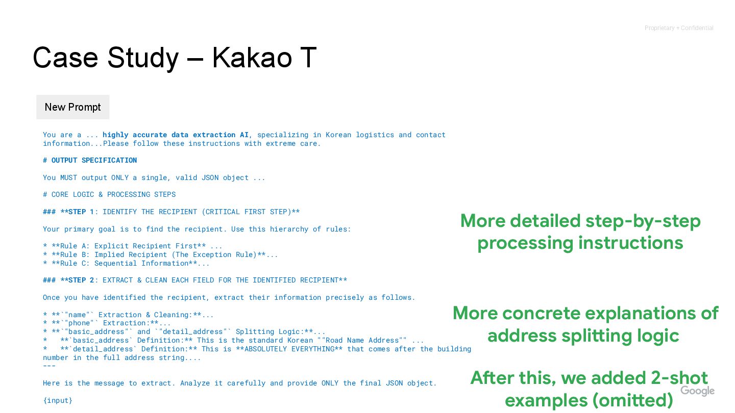 address, detail address, name, and phone number. - Output ONLY a single, valid JSON object. - Use the following structure: { ""name"": ""extracted_name"" or null, ""phone"": ""extracted_phone_number"" or null, ""basic_address"": ""extracted_basic_address"" or null, ""detail_address"": ""extracted_detail_address"" or null } - Name is the recipient's name. If multiple names are present, choose the recipient's only. - Phone number is the recipient's phone number. If multiple phone numbers are present, choose the recipient's only. - Retain the original spelling and format from the message. - Recipient is sometimes marked as: [ ... ] - Basic address consists of province, city and street. - Detail address is the remainder of the basic address. Apartment name, unit, suite, and floor number should be included in detail address, not in basic address. - The followings are example of apartment name which should be included in detail address: [ ... ] - If the information of a field is missing, set as null. Note that the field should be null, not the string ""null"". Here is the message to extract: {input} " Case Study – Kakao T Old Prompt (highly optimized by internal/external engineering teams) Common Mistakes Extracts sender information instead of recipient Incorrectly splitting basic and detailed address components