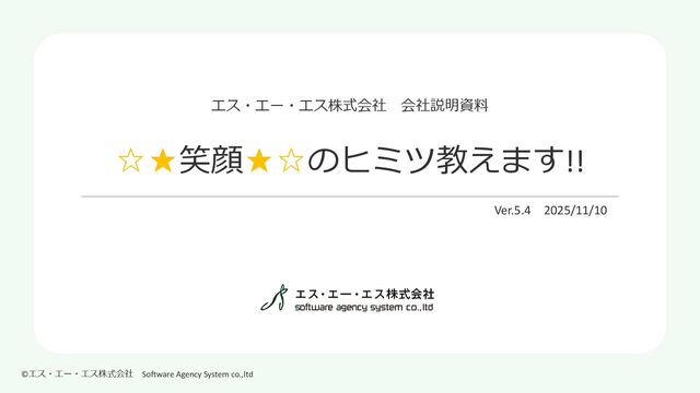 ©エス・エー・エス株式会社 Software Agency System co.,ltd エス・エー・エス株式会社 代表取締役 青山秀一 2,783,459千円(2025年2月期実績) 5,000万円(株主:役員、SAS持株会) 金融・流通・クレジット業務を中心としたシステム構築およびコンサルティング バックオフィス業務支援のクラウドサービス等の提供およびコンサルティング 文教向けソリューションの提供、多様なテーマに適応したカスタマイズ研修サービスの提供 プライバシーマーク 情報セキュリティマネジメントシステム エコステージ1 労働者派遣事業 東京ライフ・ワーク・バランス認定企業 健康優良企業「銀の認定」 健康経営優良法人2025(中小規模法人部門) PRIDE指標『ゴールド』 2019~2024 (職場でのLGBTQ+に関する取組指標) Ruby Association Certified System Integrator Silver 平成29年度東京都時差Biz推進賞 第11回「日本でいちばん大切にしたい会社」大賞 審査委員会特別賞 一般社団法人 日本クレジット協会(JCA) 一般社団法人 日本情報システム・ユーザー協会(JUAS) KT-NET 一般社団法人 日本テレワーク協会 一般社団法人ソフトウェア協会(SAJ) 人を大切にする経営学会 一般財団法人 Rubyアソシエーション 関東ITソフトウェア健康保険組合(ITS) SASクラウド株式会社 SASアシスト株式会社 SASコンサルティング株式会社 SASビジネスソリューションズ株式会社 本社所在地 社員数 設立年月日 東京都港区三田三丁目4番10号 4F 144名(単体) ※184名(グループ全体) 1995年10月4日(30期目) 4