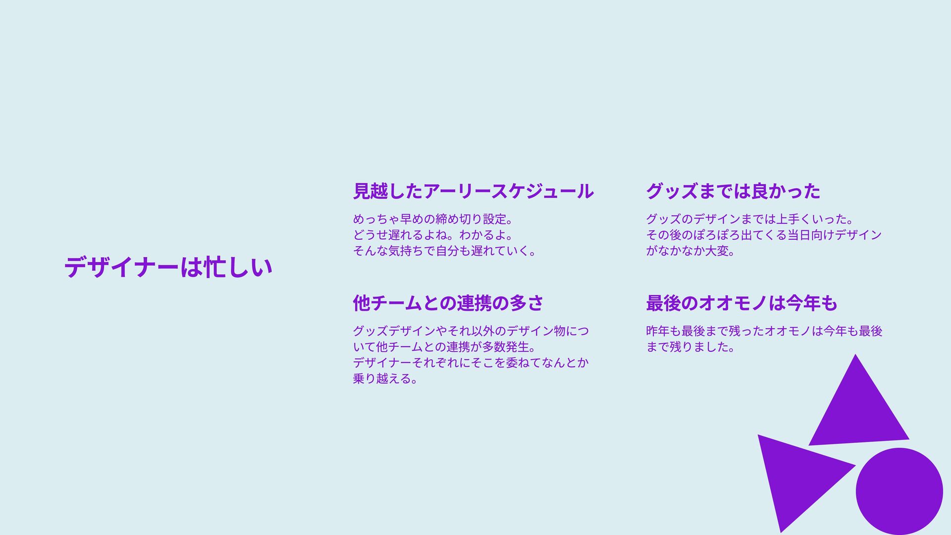 デザイナーは忙しい 見越したアーリースケジュール めっちゃ早めの締め切り設定。 どうせ遅れるよね。わかるよ。 そんな気持ちで自分も遅れていく。 他チームとの連携の多さ グッズデザインやそれ以外のデザイン物につ いて他チームとの連携が多数発生。 デザイナーそれぞれにそこを委ねてなんとか 乗り越える。