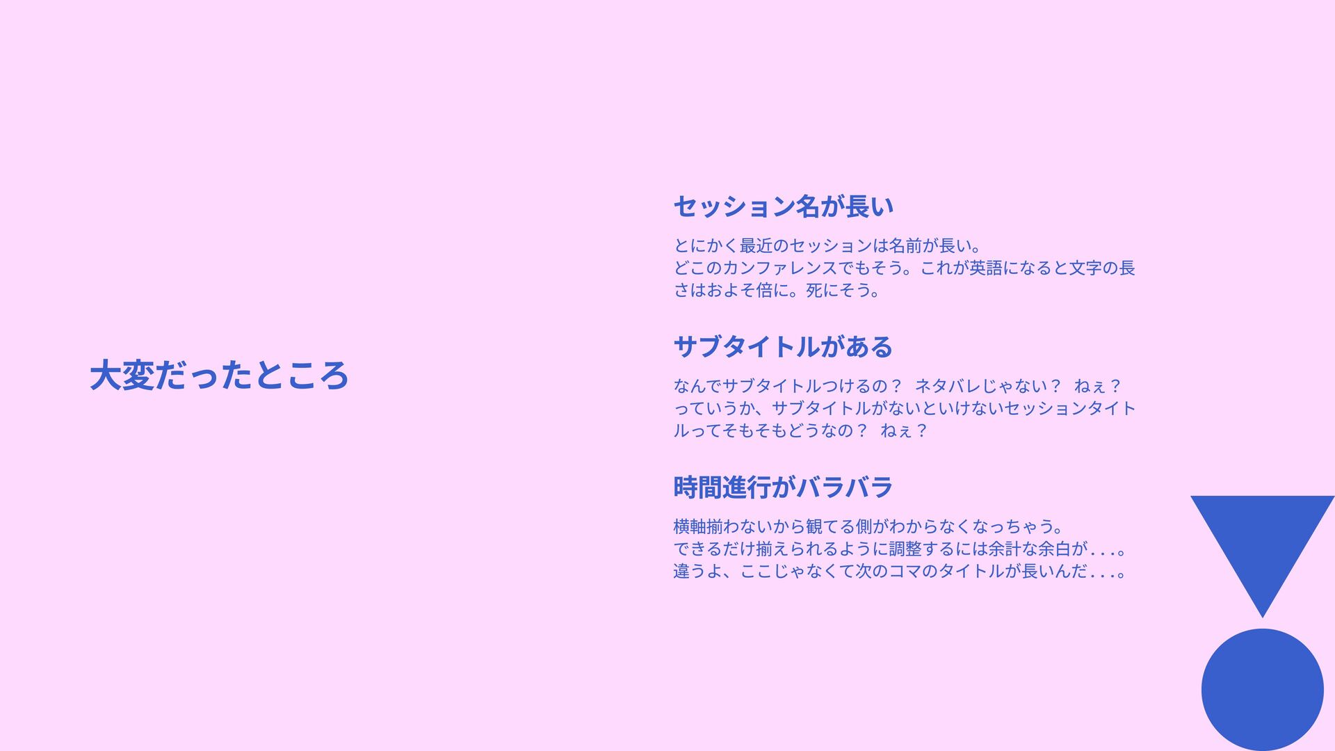 大変だったところ セッション名が長い とにかく最近のセッションは名前が長い。 どこのカンファレンスでもそう。これが英語になると文字の長 さはおよそ倍に。死にそう。 サブタイトルがある なんでサブタイトルつけるの? ネタバレじゃない? ねぇ? っていうか、サブタイトルがないといけないセッションタイト