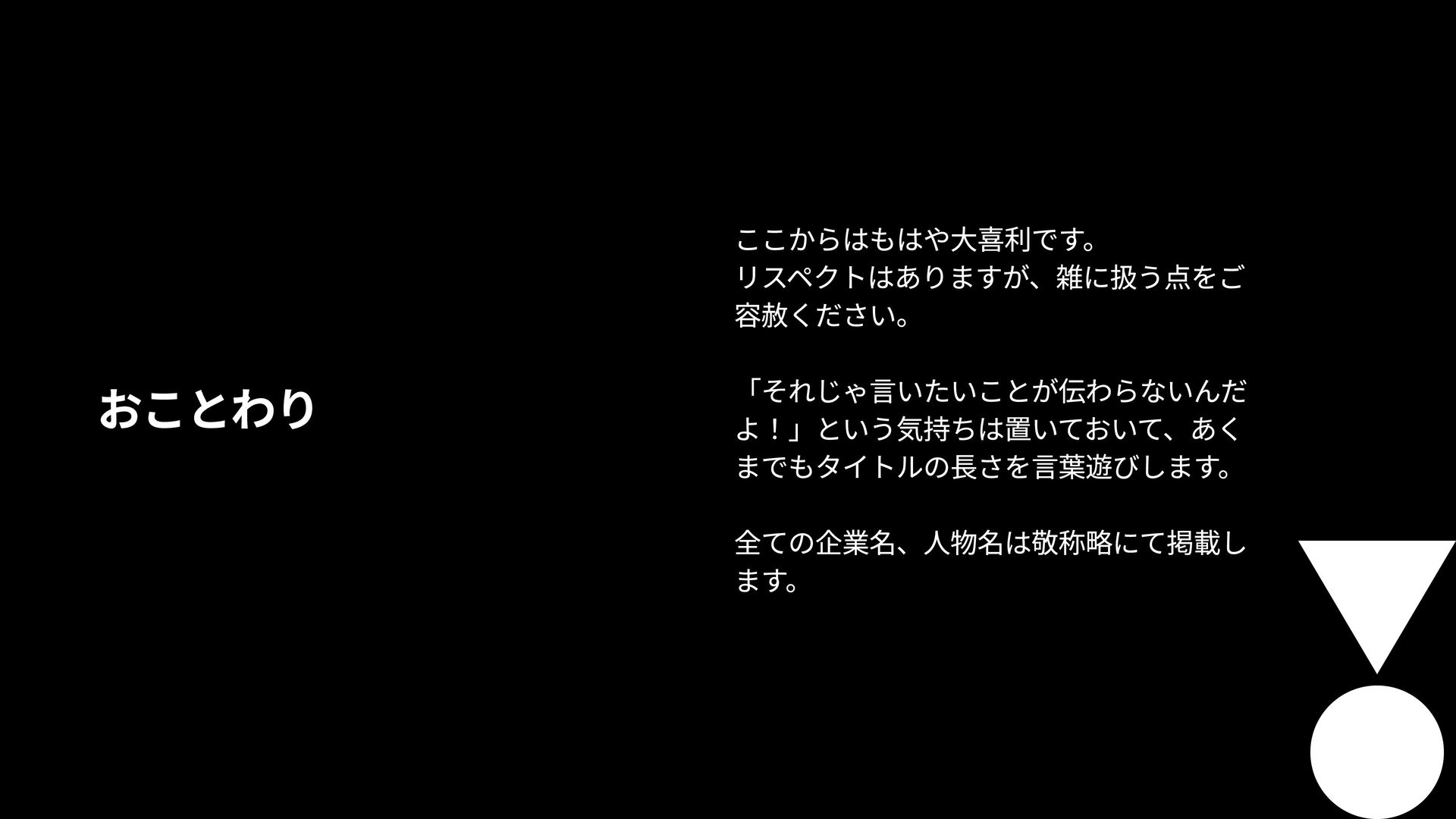 おことわり ここからはもはや大喜利です。 リスペクトはありますが、雑に扱う点をご 容赦ください。 「それじゃ言いたいことが伝わらないんだ よ!」という気持ちは置いておいて、あく までもタイトルの長さを言葉遊びします。 全ての企業名、人物名は敬称略にて掲載し ます。