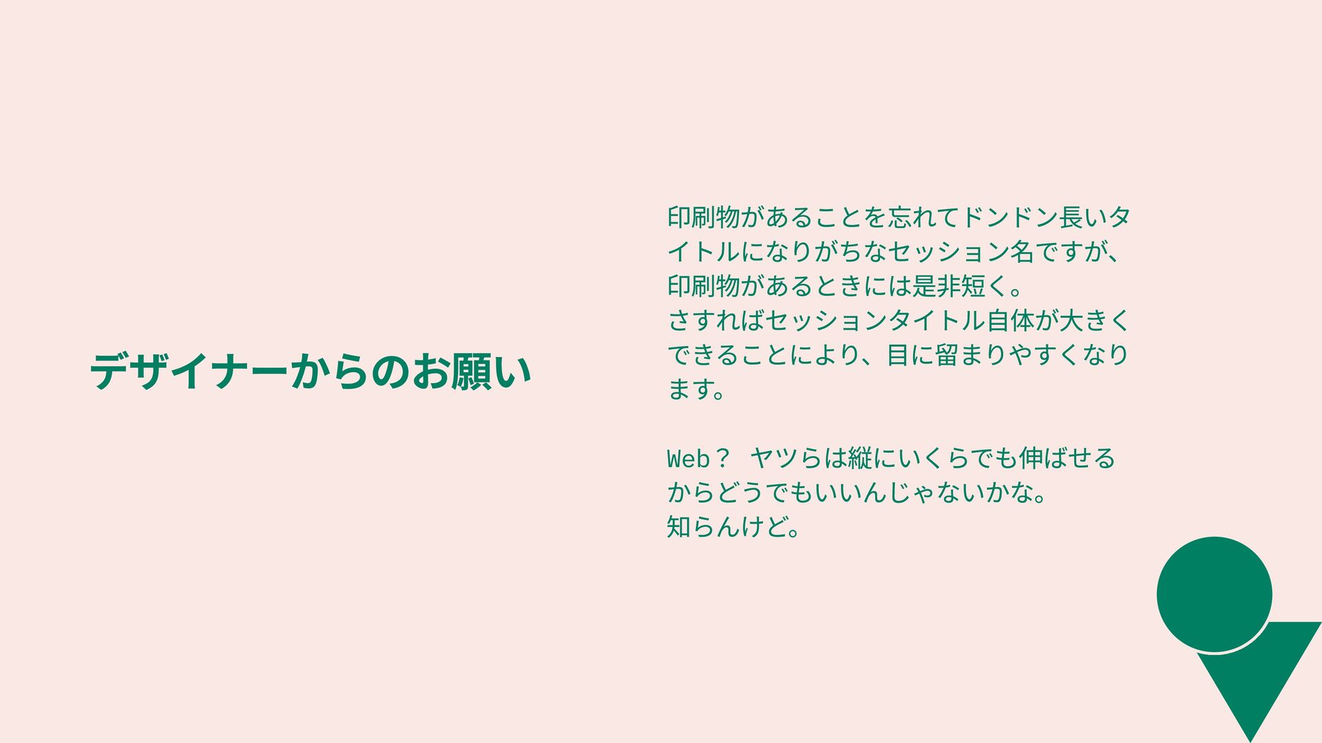 デザイナーからのお願い 印刷物があることを忘れてドンドン長いタ イトルになりがちなセッション名ですが、 印刷物があるときには是非短く。 さすればセッションタイトル自体が大きく できることにより、目に留まりやすくなり ます。 Web? ヤツらは縦にいくらでも伸ばせる からどうでもいいんじゃないかな。