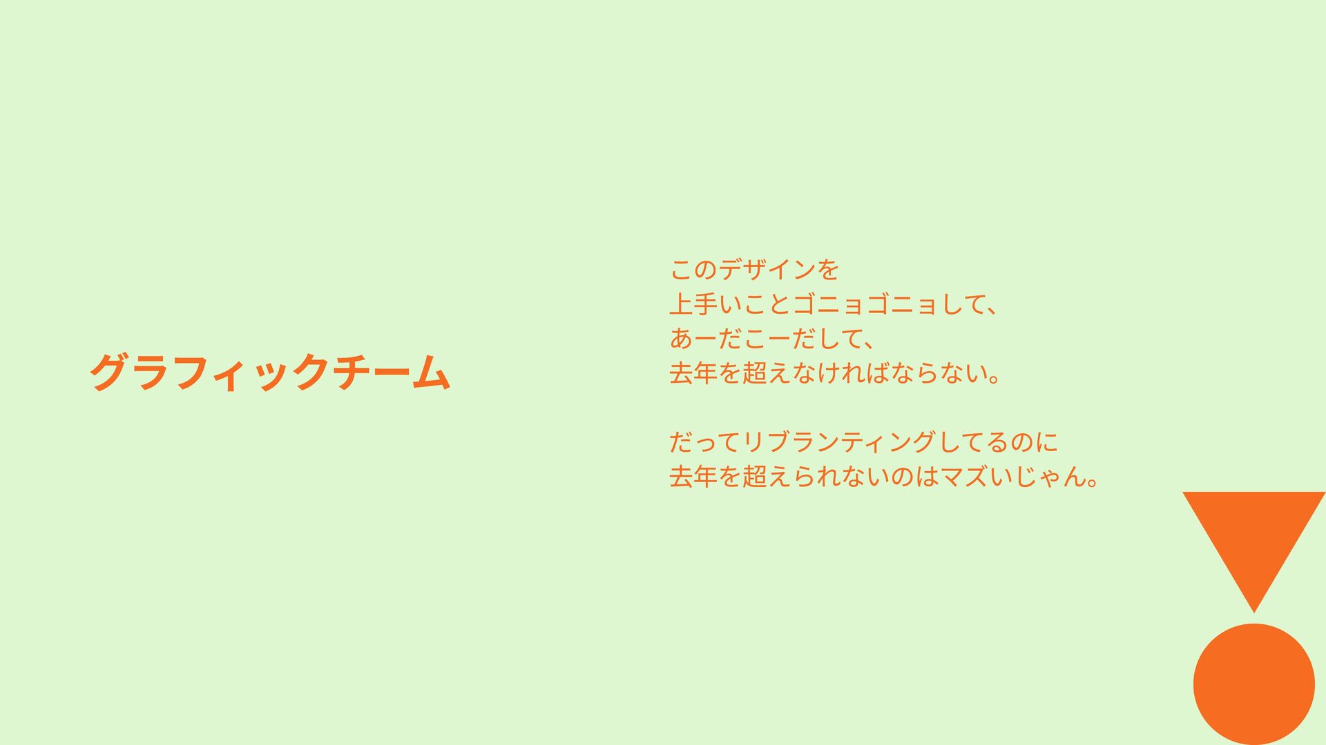 グラフィックチーム このデザインを 上手いことゴニョゴニョして、 あーだこーだして、 去年を超えなければならない。 だってリブランティングしてるのに 去年を超えられないのはマズいじゃん。