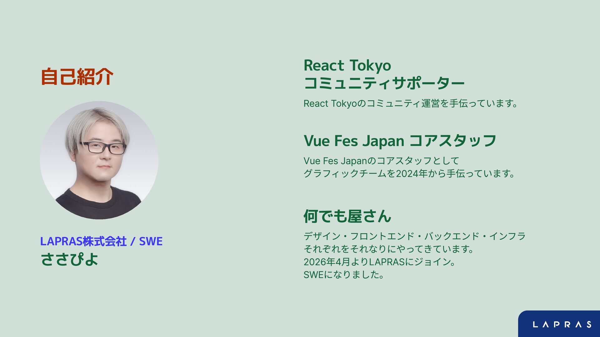 自己紹介 LAPRAS株式会社 / SWE ささぴよ React Tokyo コミュニティサポーター React Tokyoのコミュニティ運営を手伝っています。