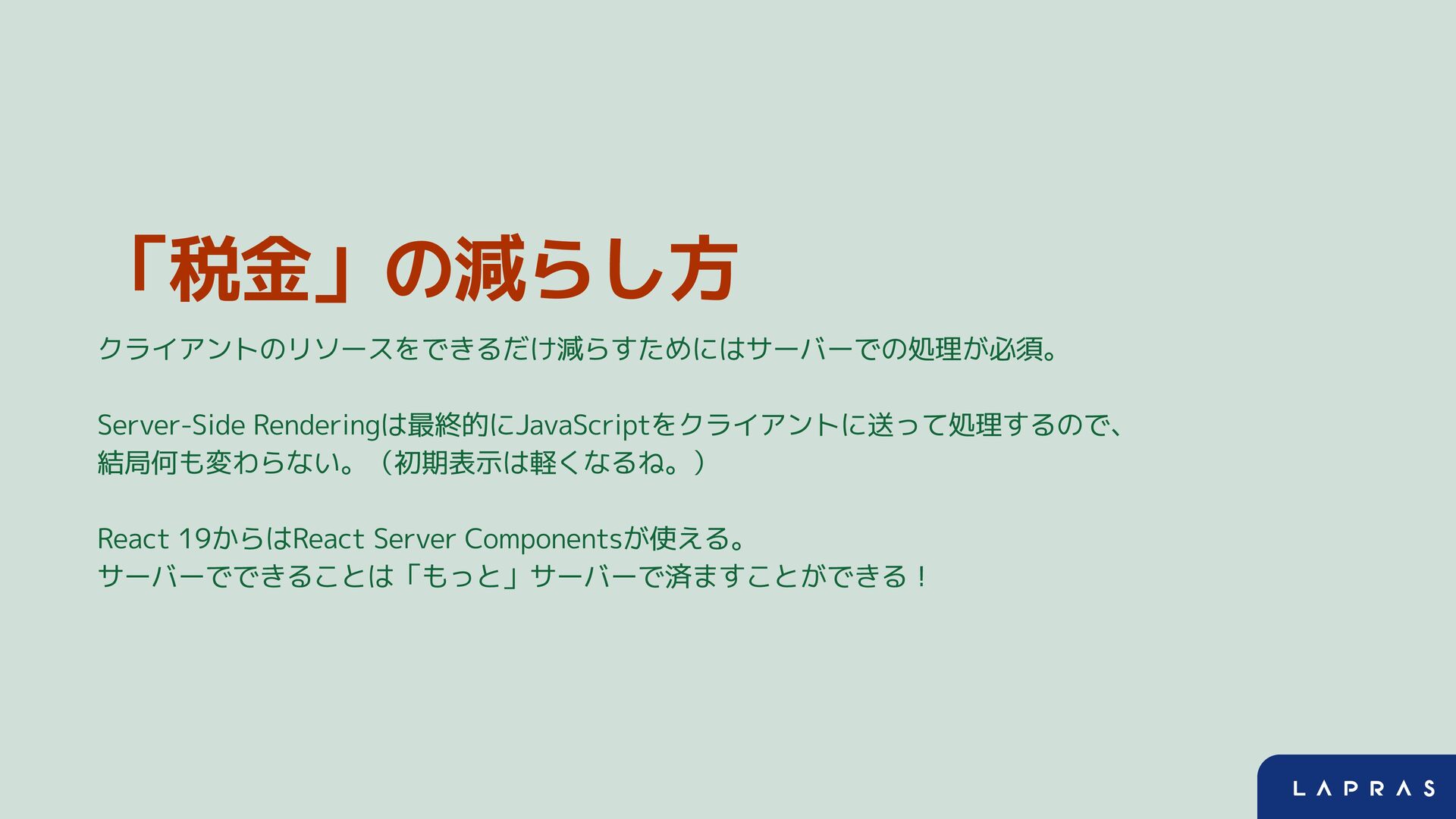 「税金」の減らし方 クライアントのリソースをできるだけ減らすためにはサーバーでの処理が必須。 Server-Side Renderingは最終的にJavaScriptをクライアントに送って処理するので、 結局何も変わらない。(初期表示は軽くなるね。) React 19からはReact Server Componentsが使える。 サーバーでできることは「もっと」サーバーで済ますことができる!