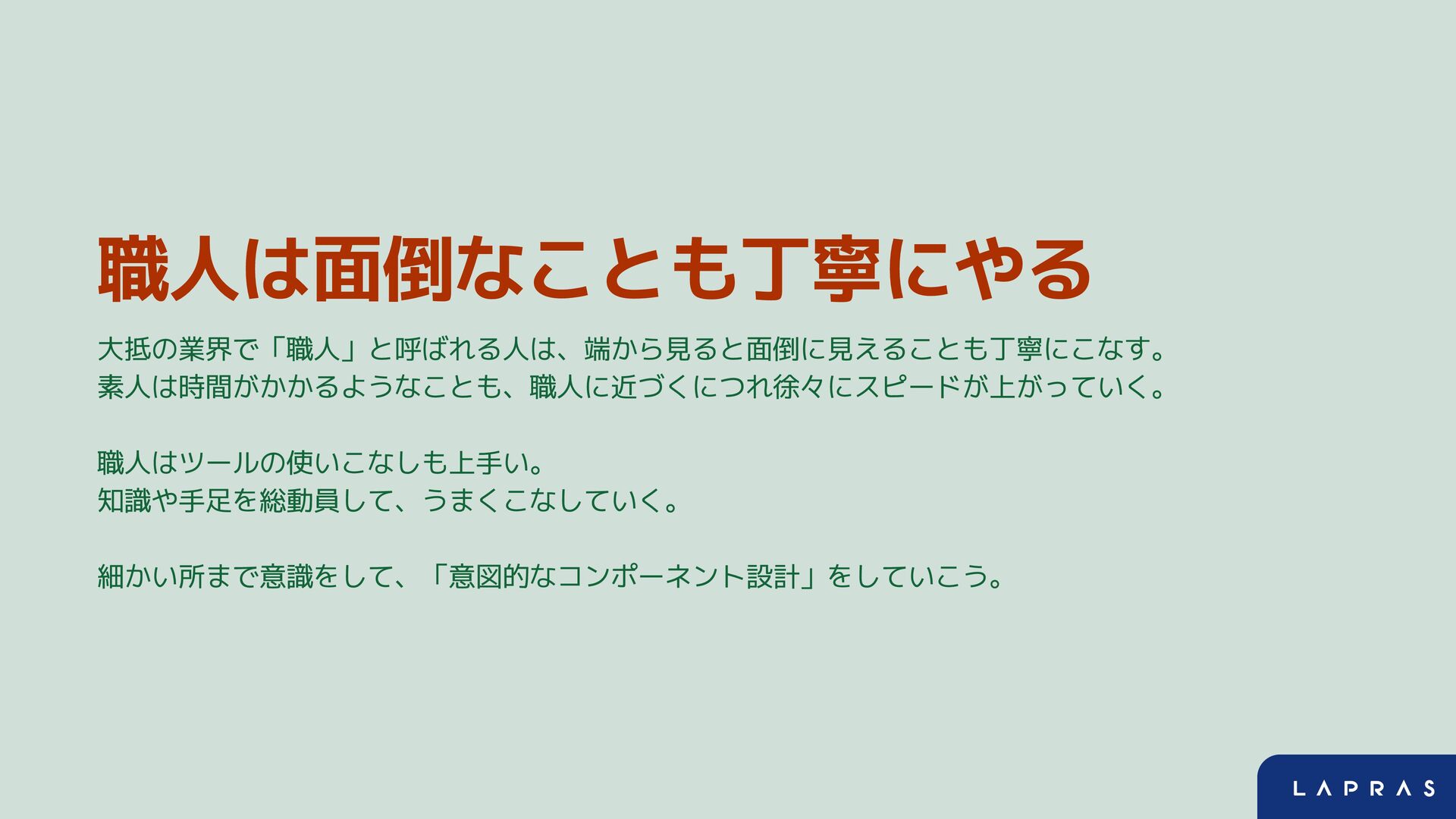 職人は面倒なことも丁寧にやる 大抵の業界で「職人」と呼ばれる人は、端から見ると面倒に見えることも丁寧にこなす。 素人は時間がかかるようなことも、職人に近づくにつれ徐々にスピードが上がっていく。 職人はツールの使いこなしも上手い。 知識や手足を総動員して、うまくこなしていく。 細かい所まで意識をして、「意図的なコンポーネント設計」をしていこう。