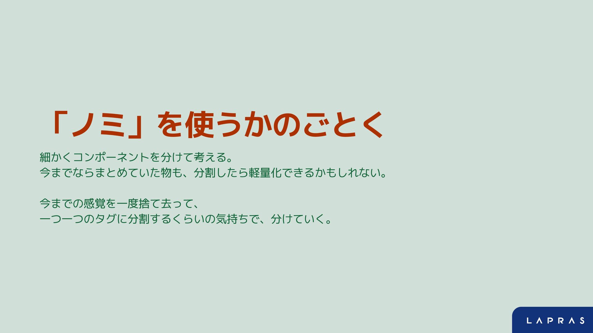 「ノミ」を使うかのごとく 細かくコンポーネントを分けて考える。 今までならまとめていた物も、分割したら軽量化できるかもしれない。 今までの感覚を一度捨て去って、 一つ一つのタグに分割するくらいの気持ちで、分けていく。