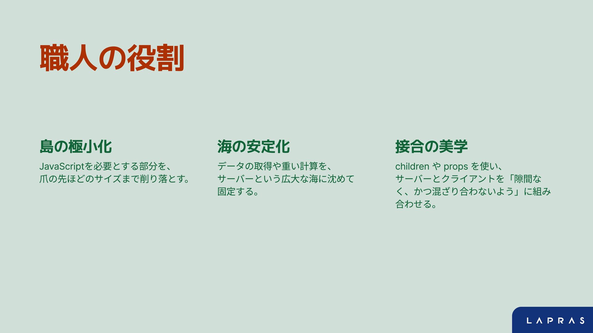 職人の役割 島の極小化 JavaScriptを必要とする部分を、 爪の先ほどのサイズまで削り落とす。 海の安定化 データの取得や重い計算を、 サーバーという広大な海に沈めて 固定する。 接合の美学 children