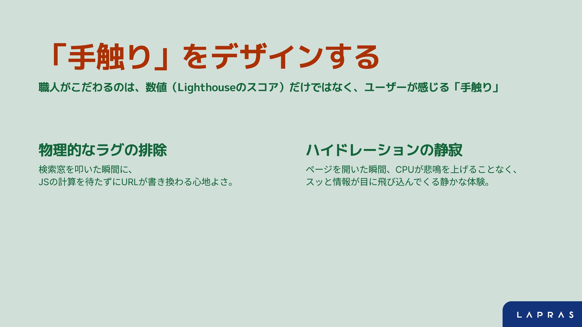 「手触り」をデザインする 職人がこだわるのは、数値(Lighthouseのスコア)だけではなく、ユーザーが感じる「手触り」 物理的なラグの排除 検索窓を叩いた瞬間に、 JSの計算を待たずにURLが書き換わる心地よさ。 ハイドレーションの静寂 ページを開いた瞬間、CPUが悲鳴を上げることなく、 スッと情報が目に飛び込んでくる静かな体験。
