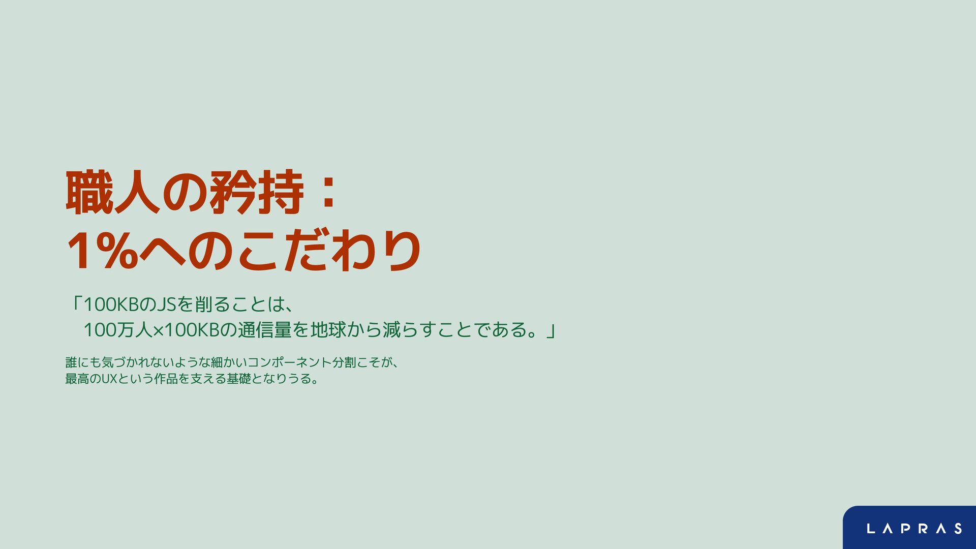 職人の矜持: 1%へのこだわり 「100KBのJSを削ることは、 100万人×100KBの通信量を地球から減らすことである。」 誰にも気づかれないような細かいコンポーネント分割こそが、 最高のUXという作品を支える基礎となりうる。